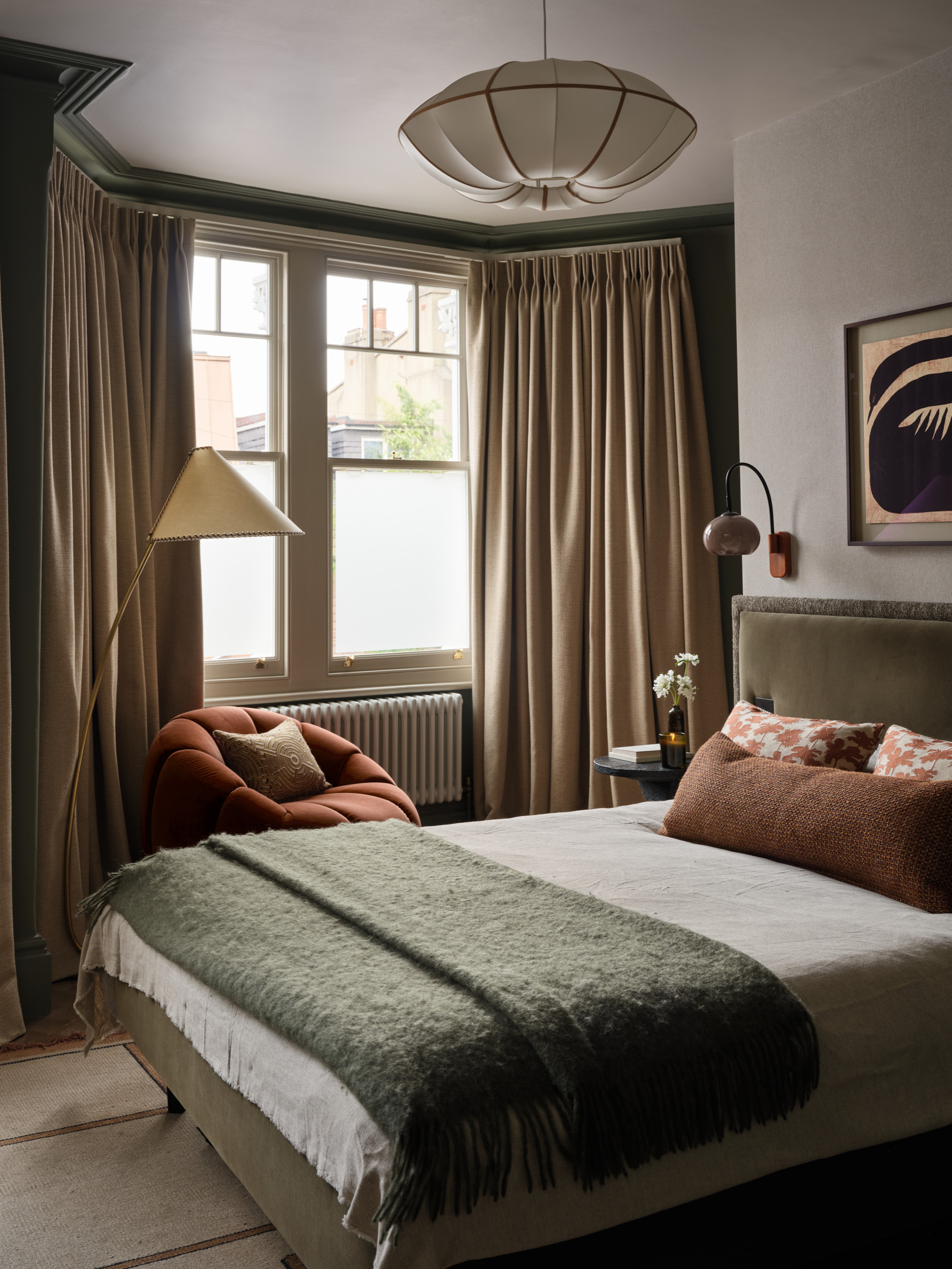 Finch Interior Design expertly blurred the boundaries of time and space with this recently designed hideaway. The army green, burnt orange and tan color palette feels pulled from the 1940s through the 1970s. The furnishings, particularly the channel-stitched saucer-style chair and trio of light fixtures, have a decidedly retro slant. And when those comfortingly heavy drapes are closed against the street view, who’s to know whether it’s in London, San Francisco or New York City? (Take a guess, then see if you were right by clicking the photo to see the bedroom’s location.)