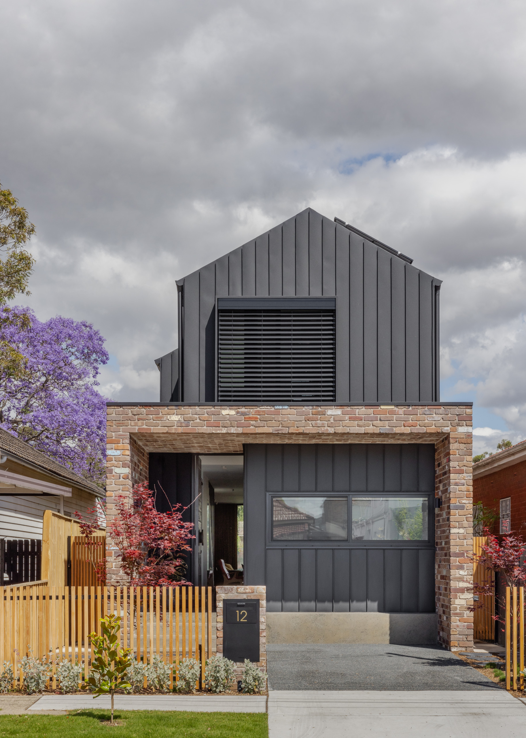 This Sydney home by Amrish Maharaj Architecture offers a master class in balance and contrast. Modern charcoal siding has been paired with warm brick, while vertical and horizontal lines have been carefully calibrated to create a facade that’s both striking and harmonious. The result is a front elevation that commands attention without feeling overdone.