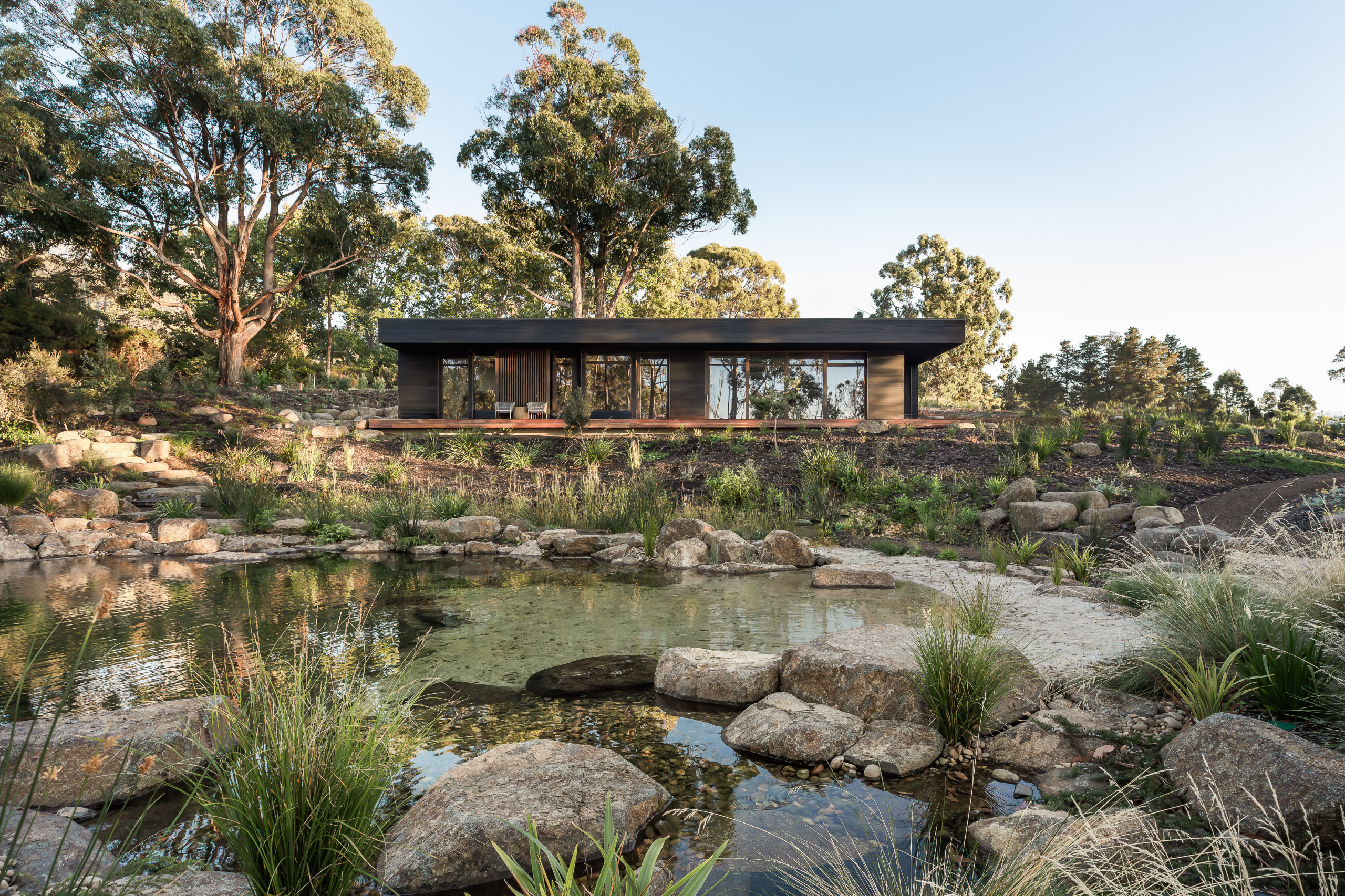 Perched above a restored wetland in Hobart, Australia, this sustainable modern home by Biotope Architecture and Interiors blurs the boundary between indoors and out. Expansive floor-to-ceiling windows and doors frame ever-changing views, allowing the surrounding ecosystem — once a dammed pond, now a thriving area — to be a living part of the design.