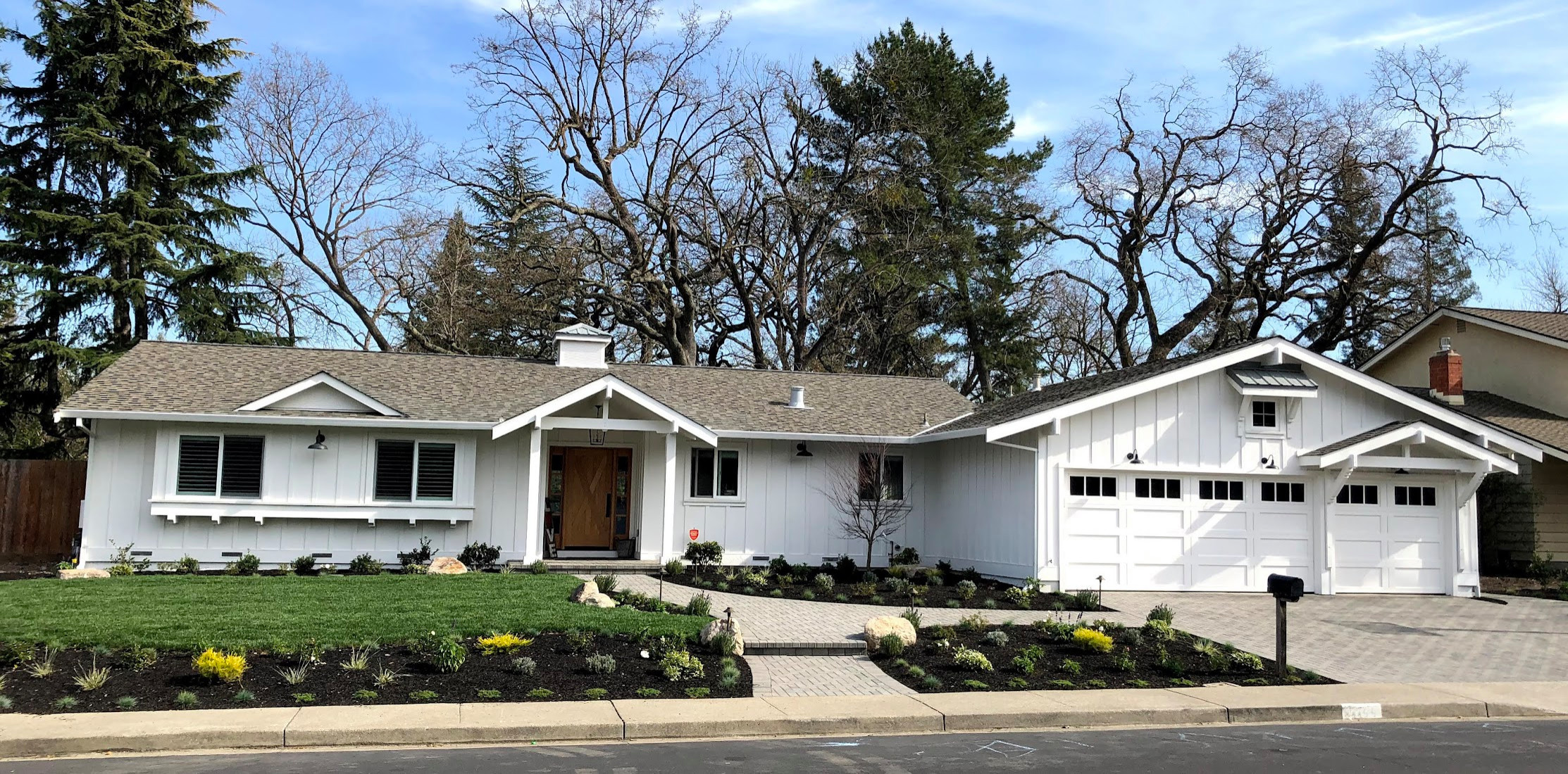 This midcentury ranch in Danville, California, needed a curb appeal boost. Barry & Wynn Architects transformed its flat facade and dated stone details with white board-and-batten siding, a window bay, a cozy front porch, a cupola and fresh landscaping. The result is a home full of dimension and character, with a welcoming modern farmhouse vibe.
