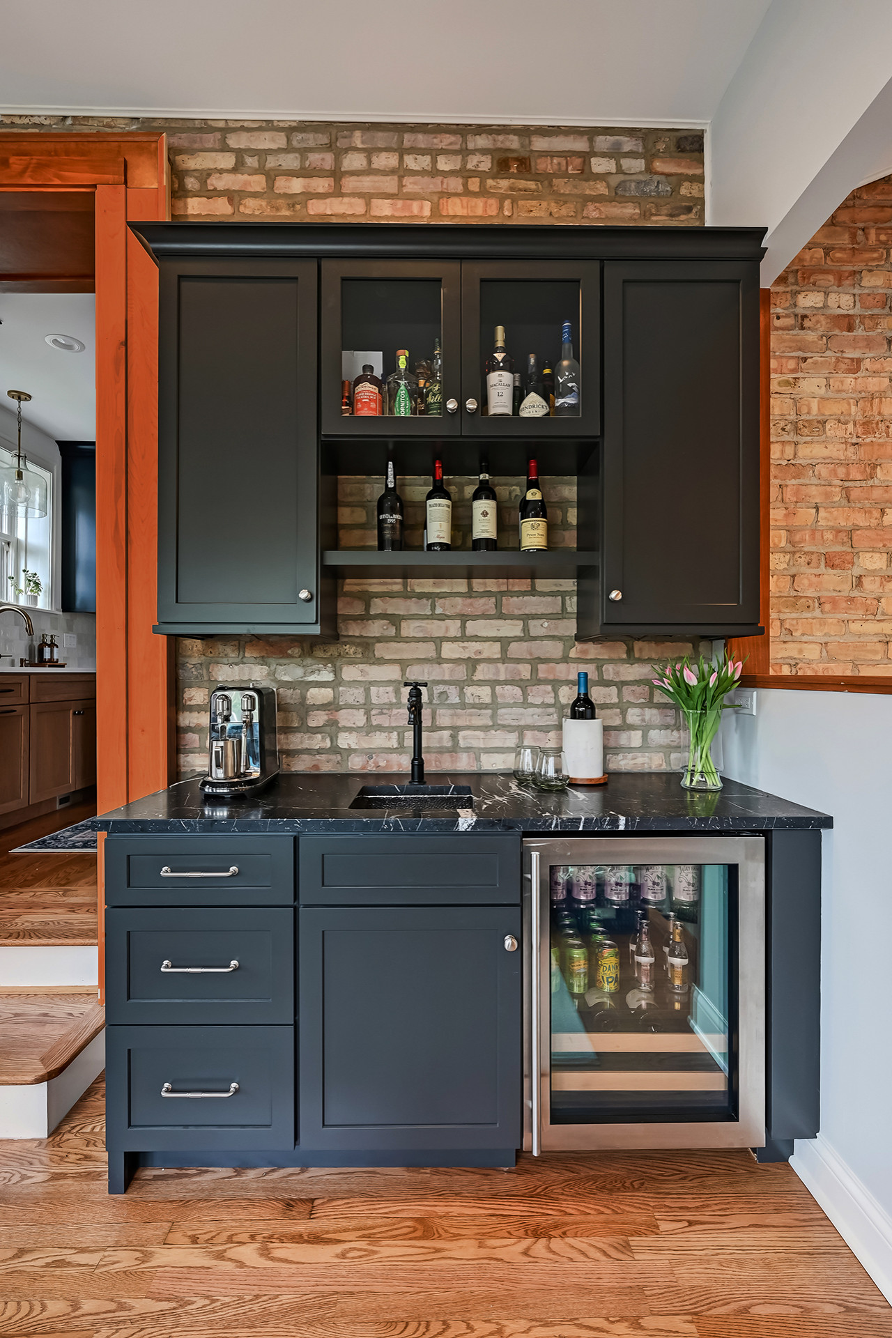 Fourth Avenue Design Group mixed a brick wall with black cabinetry in this home bar near Chicago, creating a polished urban design that works beautifully with the nearby kitchen. A black marble-style countertop with white veining enhances the refinement, while a sink and a beverage fridge add convenience. Open shelves and glass-front cabinets make bottles easy to spot, and a coffee maker doubles the utility.
