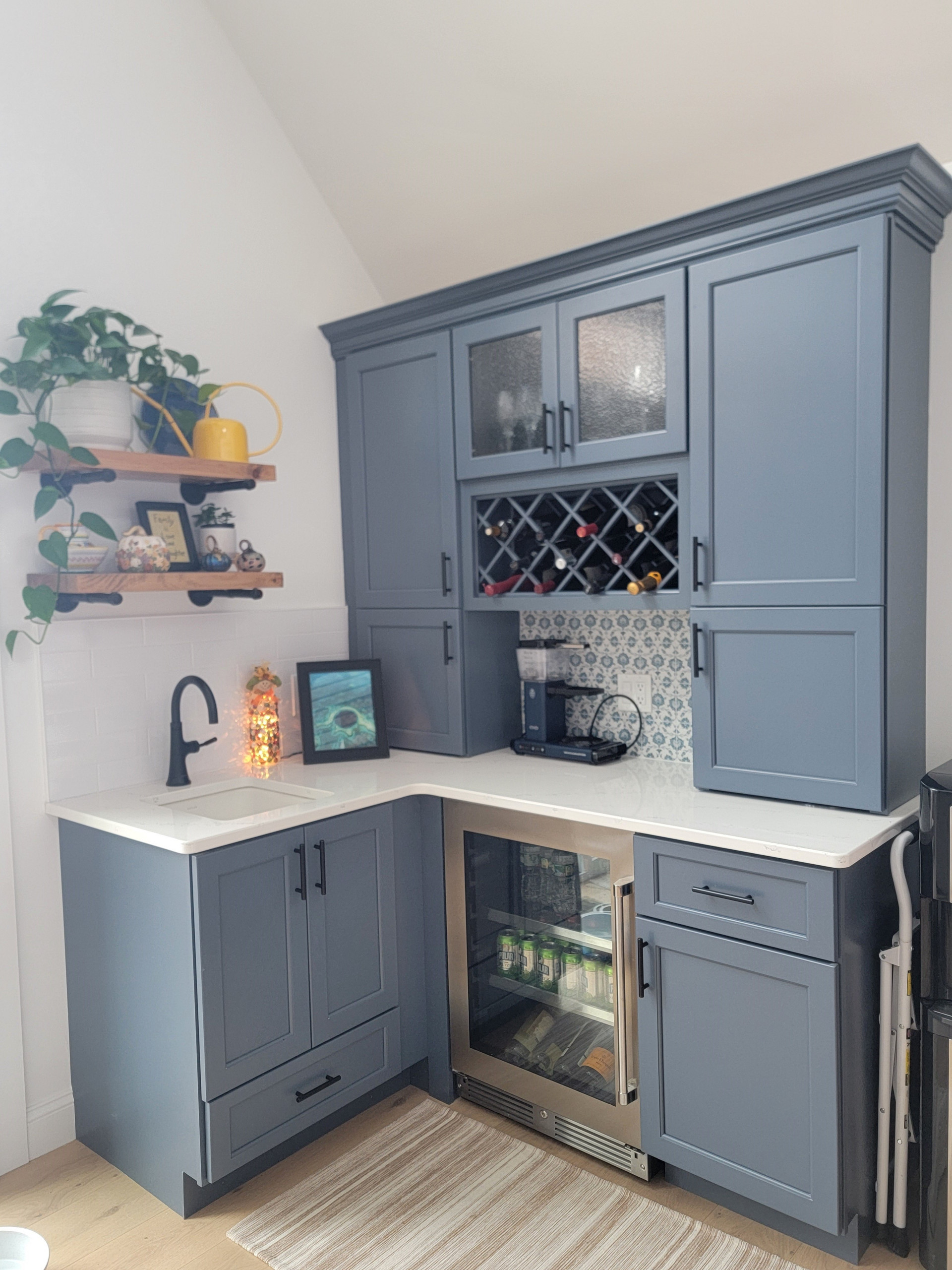 Substantial blue-gray cabinets anchor this lake house home bar in New England, keeping many items tucked away for a tidy look. A patterned blue-and-white backsplash, crosshatch-style wine storage and glass-front uppers break up the cabinets to avoid an overly solid feel, while decor-laden open shelves create visual balance. Designer Myste Kirkorian paid as much attention to practicality as to aesthetics, adding a beverage fridge, a coffee maker and a sink so the area can multitask.