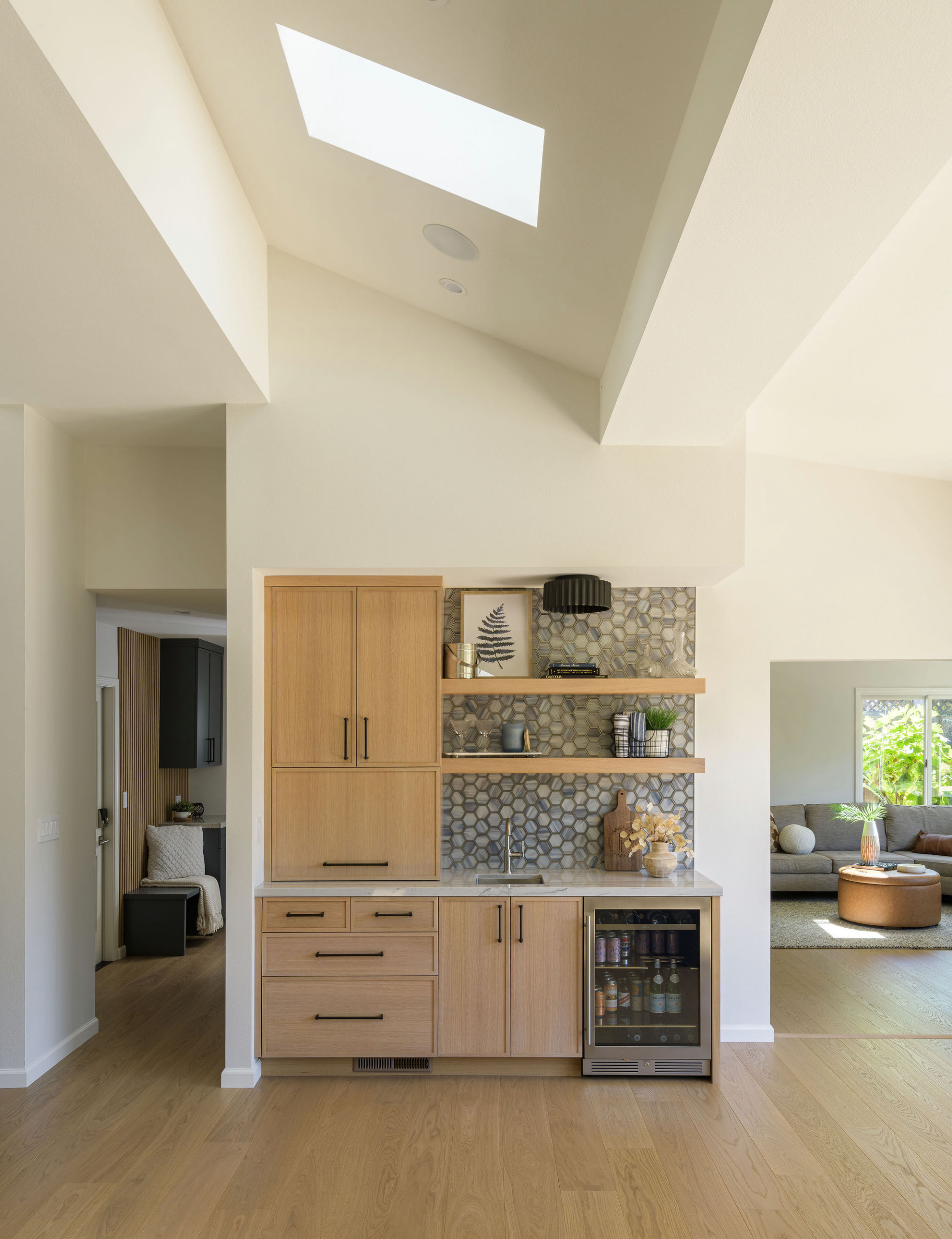 Hexagonal tile with varying lines and in a mix of shades, along with an angled ceiling and skylight, gives this San Francisco Bay Area home bar energy and movement. But design-build firm Barcci Builders kept the overall effect soothing by using wood cabinetry in a midtone hue similar to the flooring, as well as a backdrop of creamy white wall and ceiling paint. Decor-laden open shelves and an artful light fixture turn what could have been a merely practical way station between the kitchen and the living room into an eye-pleasing element.