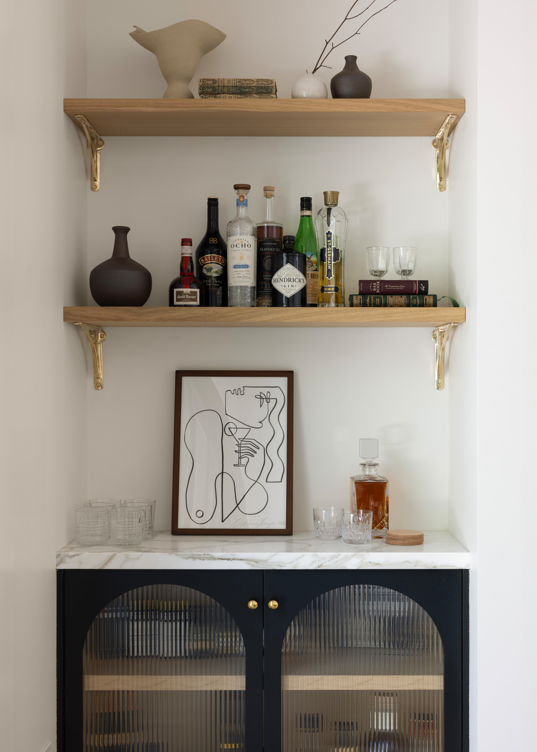 Organic touches meet modern refinement in this San Francisco home bar by Katie Severns Design. Open wood shelves hold not just bottles but pottery-style vases and branches, while a white marble-style countertop above black cabinets with gracefully arched glass fronts brings the elegance. Abstract art and golden shelf brackets elevate the look even further.