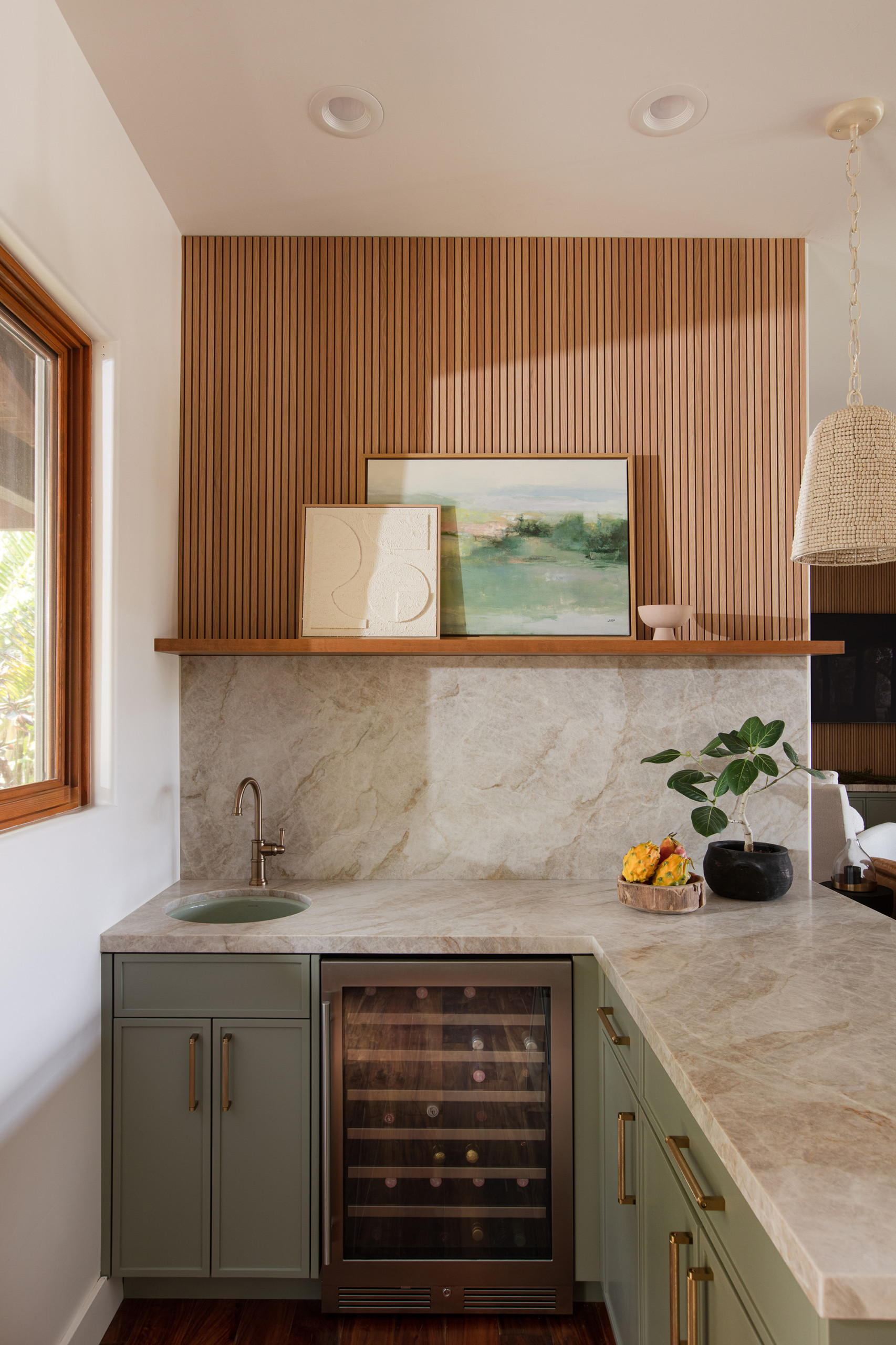 A home bar doesn’t have to be a stand-alone unit, as this corner of a San Diego kitchen shows. Blythe Interiors incorporated a beverage fridge, small sink and slender cabinet next to a window with a green view. Slatted wood on the upper portion of the wall defines the area within the kitchen and boosts character and texture, while a marbled backsplash flows right down and over onto the main kitchen’s cabinets for cohesion. A slender picture rail takes up less space than a standard floating shelf — just right for the compact area — and allows the homeowners to easily change out the artwork if they like.