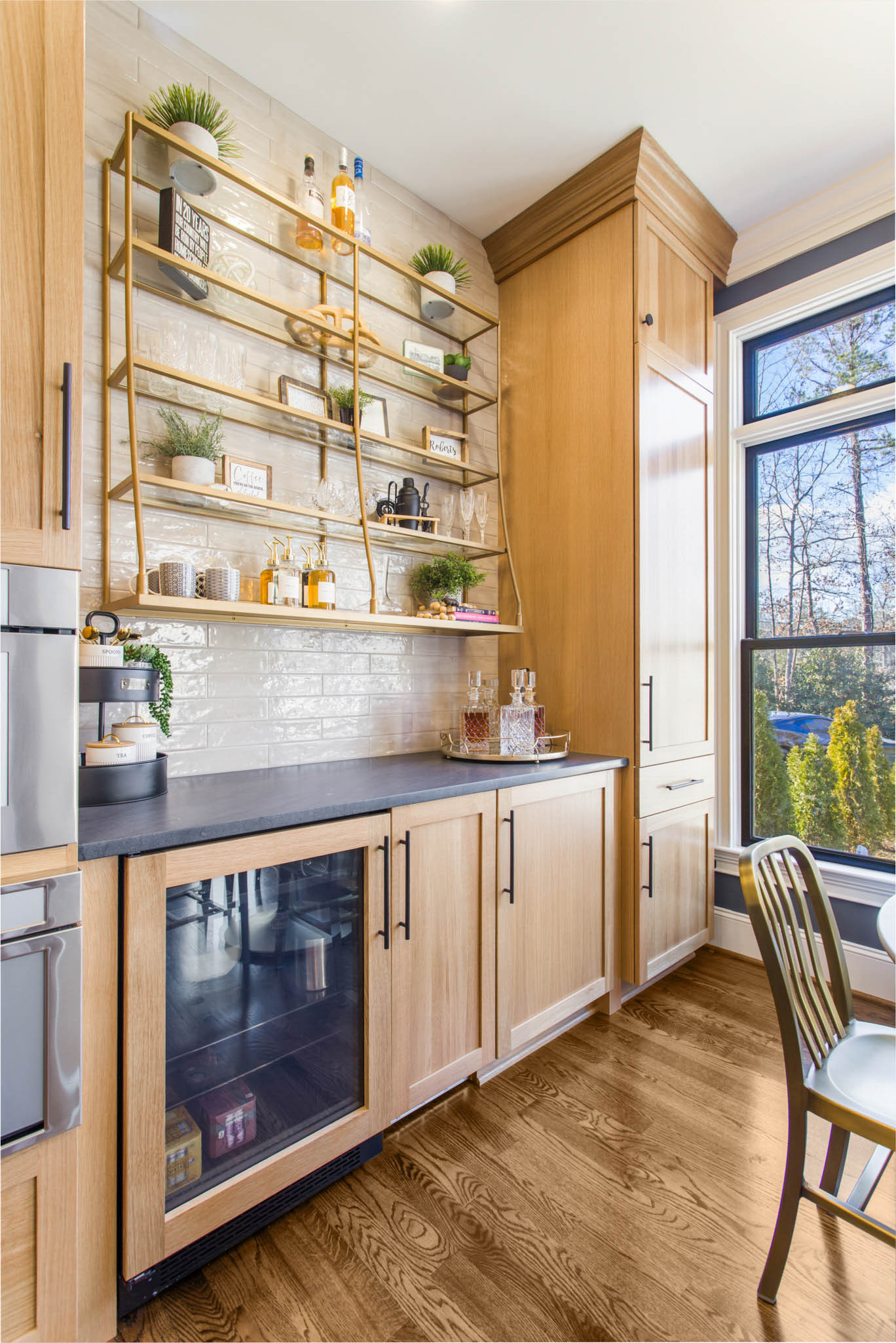 Here’s another home bar area incorporated within a kitchen. The South Carolina space, by design-build firm Ferguson Builders, is a focal point thanks to artful angled open shelves with decor as well as bar accoutrements. A wide beverage fridge offers plenty of room for sodas and mixers, and the countertop can double as a place for prepping or serving meals. Glossy elongated subway tile on the backsplash brings interest, but it’s subtle enough not to detract from the window view nearby.