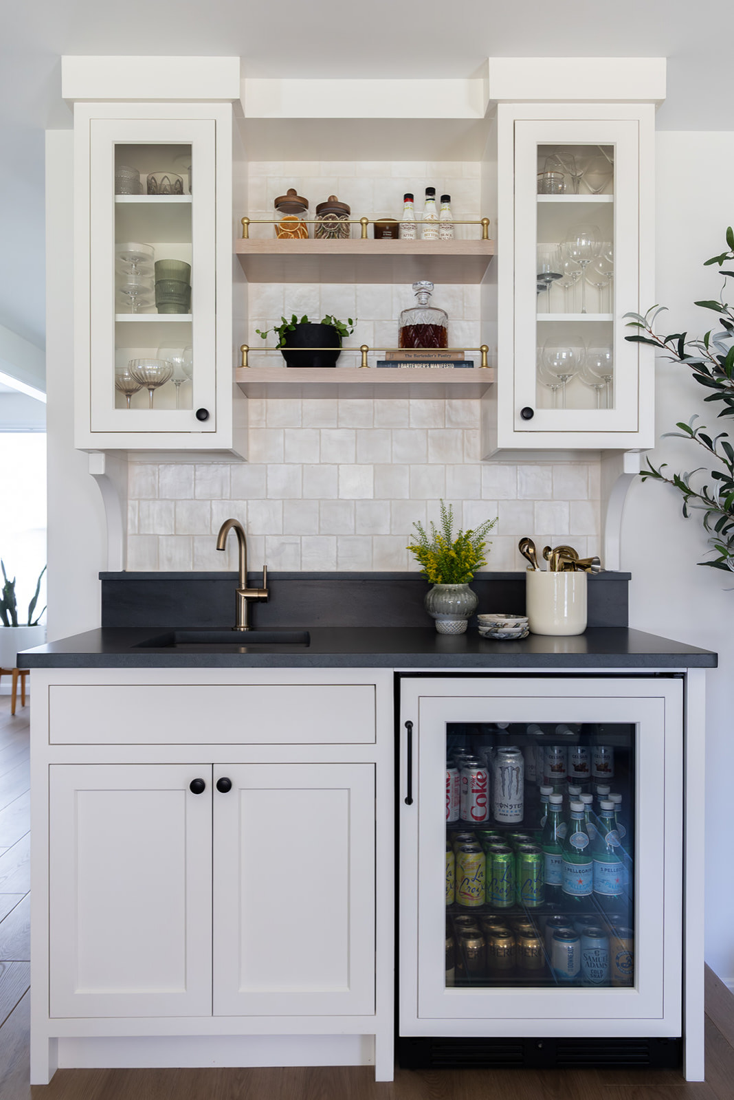 A black countertop and low backsplash stand out against a backdrop of different shades of white in this home bar near Boston. Design firm McGuire + Co. Kitchen & Bath and Fresh Start Contracting created the transitional space, which has open shelves and glass-front upper cabinets for an airy feel, glossy white wall tiles that add a lively note, and a sink and beverage fridge for convenience. Clever move: The shelves have guardrails to prevent accidental tip-overs, and in their shining gold tone, they enhance the bar’s style as well.