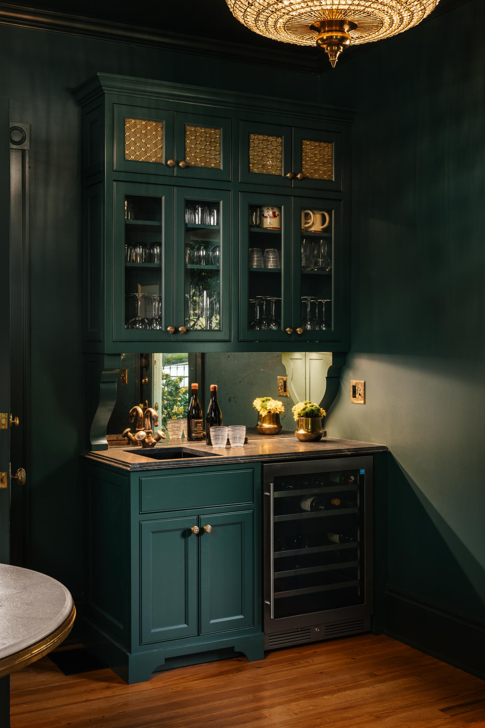 For an early-1900s Queen Anne home in Atlanta’s historic Inman Park neighborhood, design-build firm Carl Mattison Design and Hagan Architects created a home bar that leans traditional but fits modern times. The backbone is luxurious deep green cabinetry, brightened by sumptuously detailed golden fronts on the uppers as well as a dramatic golden light fixture. A mirror backsplash adds a dash of openness that keeps the deep-colored design from feeling too heavy.