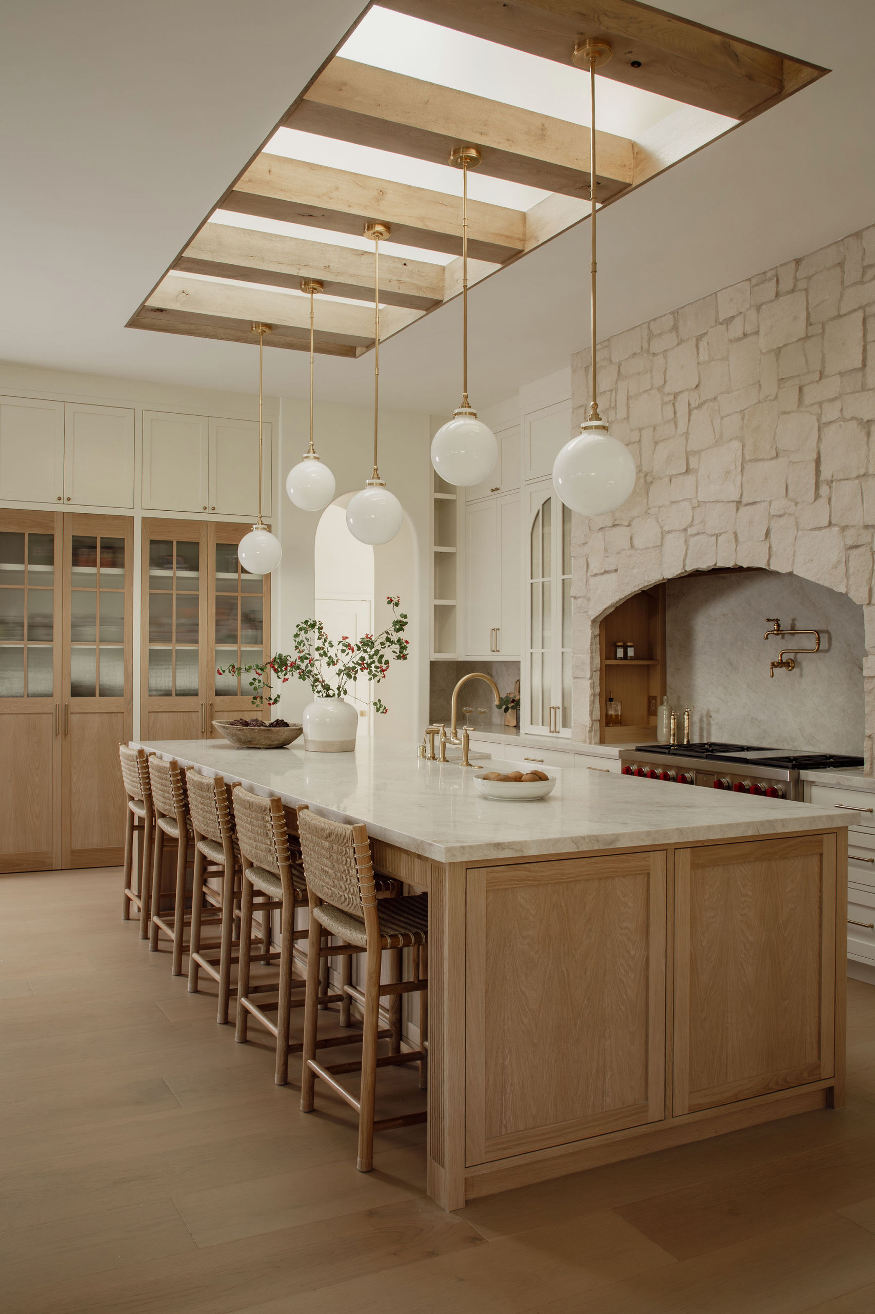 In this Thousand Oaks, California, kitchen, Joey Snow Design combined warm white and light oak finishes with natural textures, soft arches and custom details for a European-inspired look. Five orb pendant lights hang at staggered heights above the island, whose subtly veined beige countertop complements the rustic stone alcove range hood.