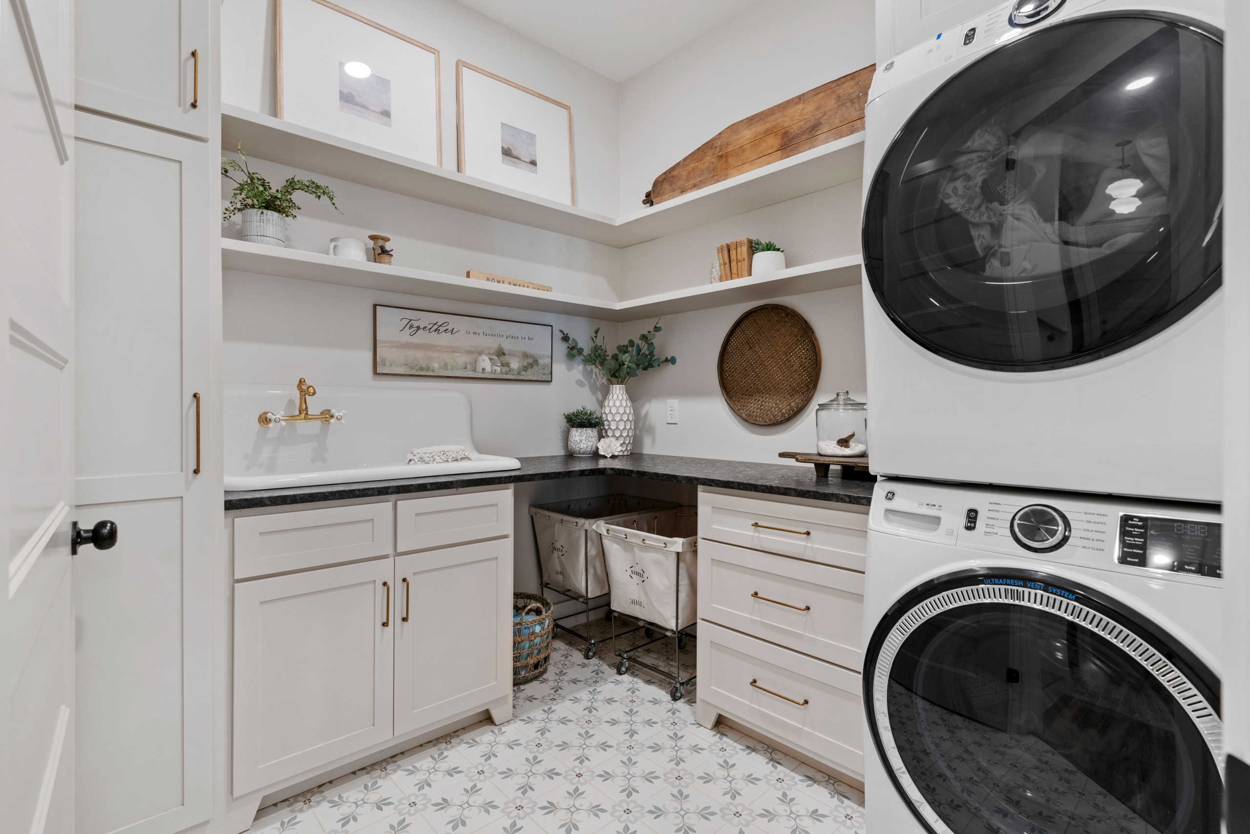 Thoughtful storage meets farmhouse freshness in this Georgia laundry room. The space was designed by Megan Bolz of MB Designs and built by MDH Design & Build, which uses Houzz Pro to manage its business. The room has drawers conveniently placed next to the stacked washer and dryer, cabinets for detergent jugs and other large items, and a tall cabinet with an outlet for keeping cleaning appliances at the ready. Baskets under the counter can keep lights and darks or dirty and clean clothes separate. An extra-long sink offers plenty of room for soaking and rinsing. And the whole space is drenched in a soothing creamy white with a few contrasting elements for interest.