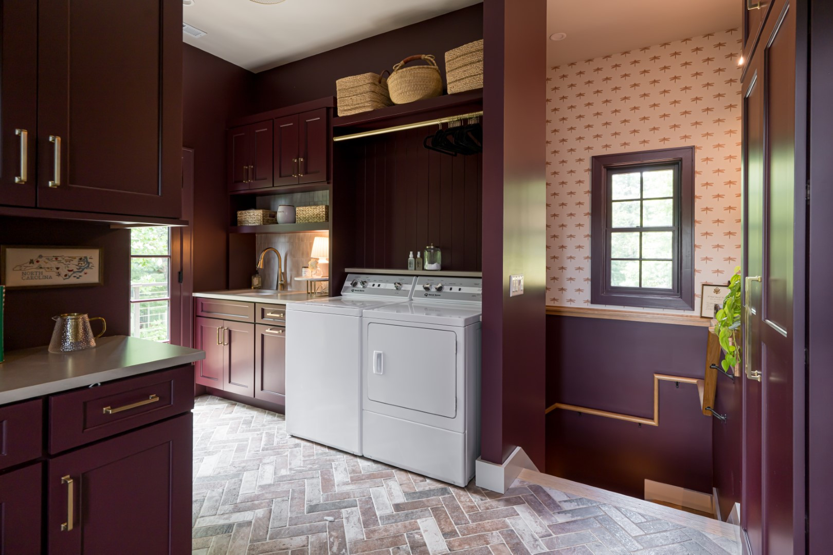 Eschewing a light and airy color palette in favor of deep purple cabinets, walls and millwork, April Gahagan of FS Design Group gave this laundry area a rich, layered look. Because the space, brought to life by Judd Builders in North Carolina, also serves as a side foyer, mudroom and pantry — a high-traffic area, in other words — the designer carefully balanced aesthetics with practicality. For instance, dragonfly wallpaper has been placed higher up, above sturdier wainscoting, to keep it out of harm’s way. And the flooring is durable brick, given an elevated look thanks to varying shades and a herringbone pattern.