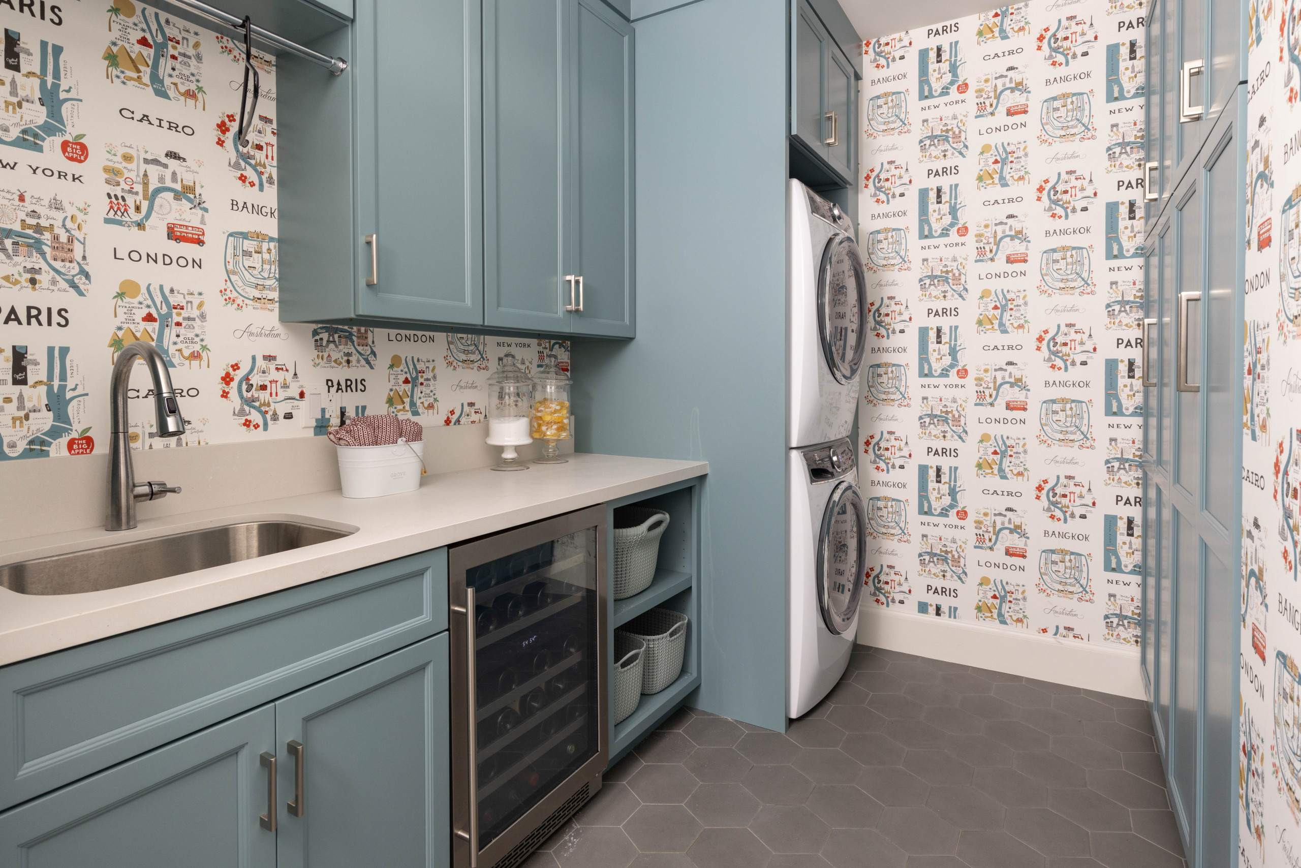 The pretty blue-gray cabinet color and fun travel-celebrating wallpaper might catch the eye first, but Surrina Plemons Interiors and Laurel McAteer of Studio Haven Interiors incorporated more than immediately meets the eye in this basement-level San Francisco Bay Area laundry room. A laundry chute is hiding in those tall cabinets on the right, a full-size refrigerator and freezer (not seen) sit to the left of the sink, and a wine fridge has a home next to the sink.