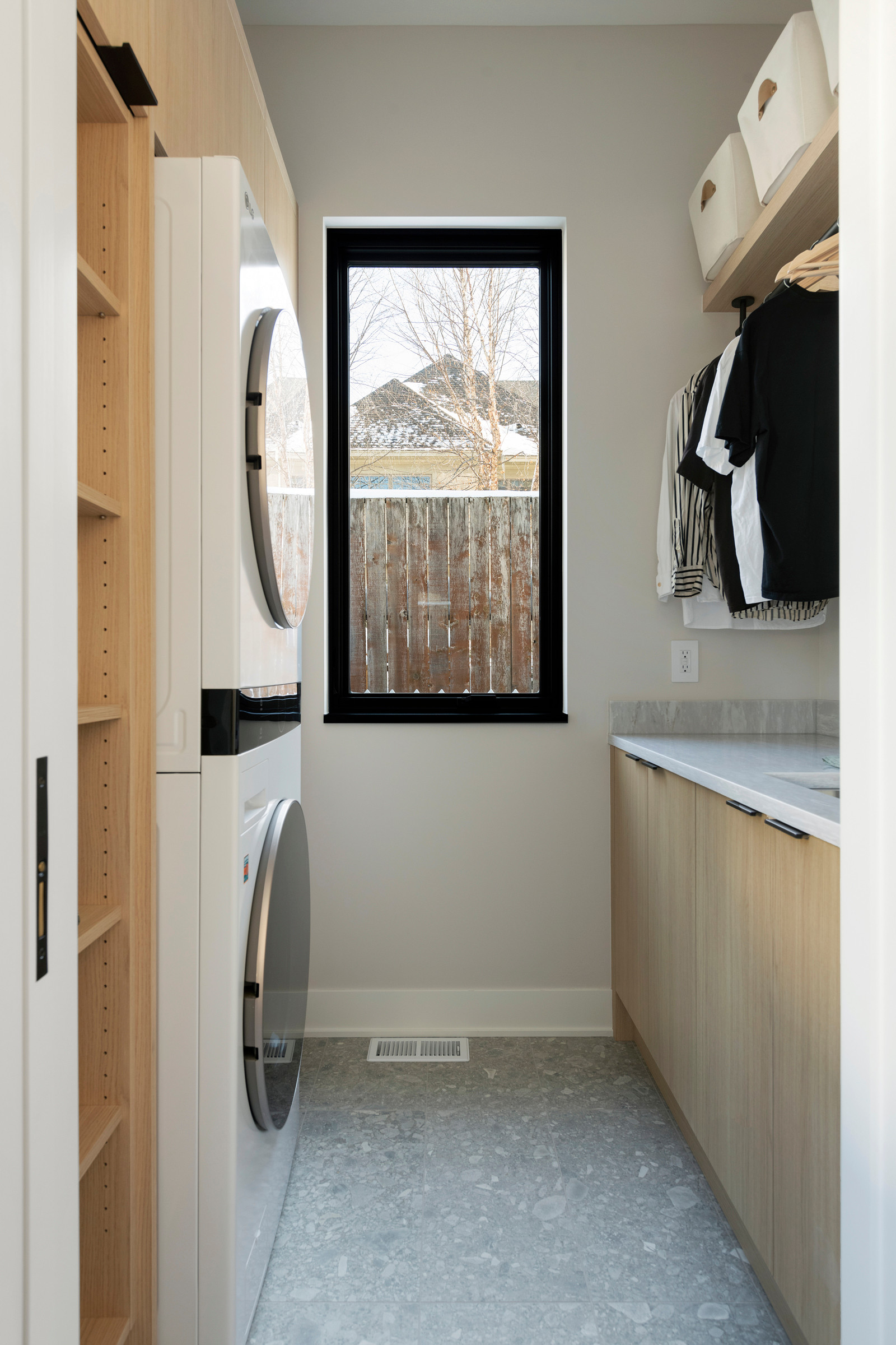 Stacking the washer and dryer in this narrow laundry room allowed Sustainable Nine Design + Build to pack in a shelving unit along the side. The space, in a Minneapolis row house, also has closed upper and lower cabinets and baskets perched on an open shelf, to give every product a tucked-away place. A drying rod and sink round out the convenience features, while the palette relies on soft neutrals for ease on the eyes. As in the previous example, however, a striking black window frame cleverly pulls the gaze outdoors.