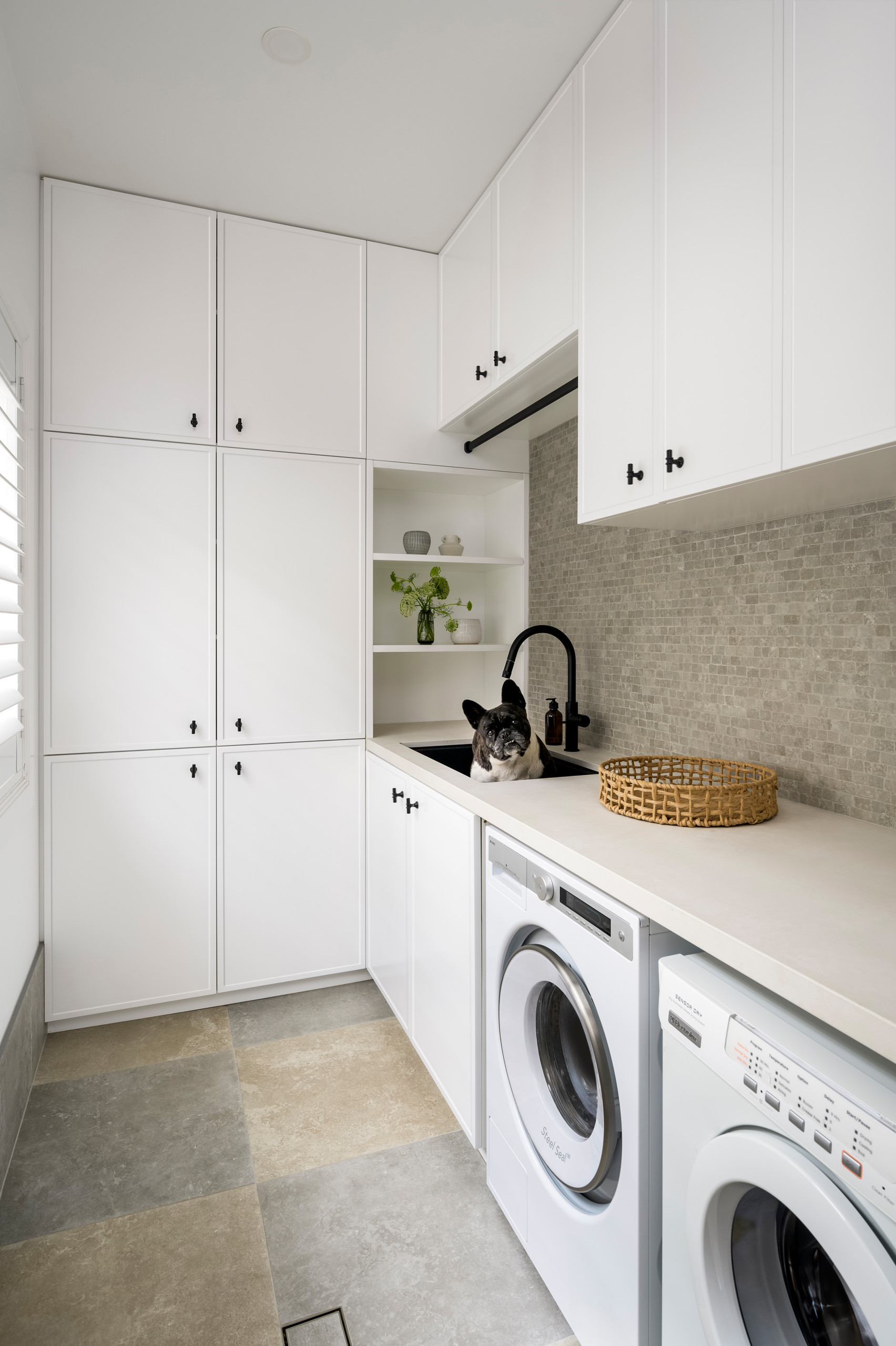 Grid-style lines help break up the plentiful white cabinetry in this New South Wales, Australia, laundry room by Horton & Co., but just enough to create interest and not interrupt any chore-time daydreaming. The flooring design has boxes of its own and contributes grounding stone-like colors, while small wall tiles in various beige and brown tones add a complementary touch and give the eye another place to land. A drying rod, a spacious countertop and open shelves with decor complete the picture.