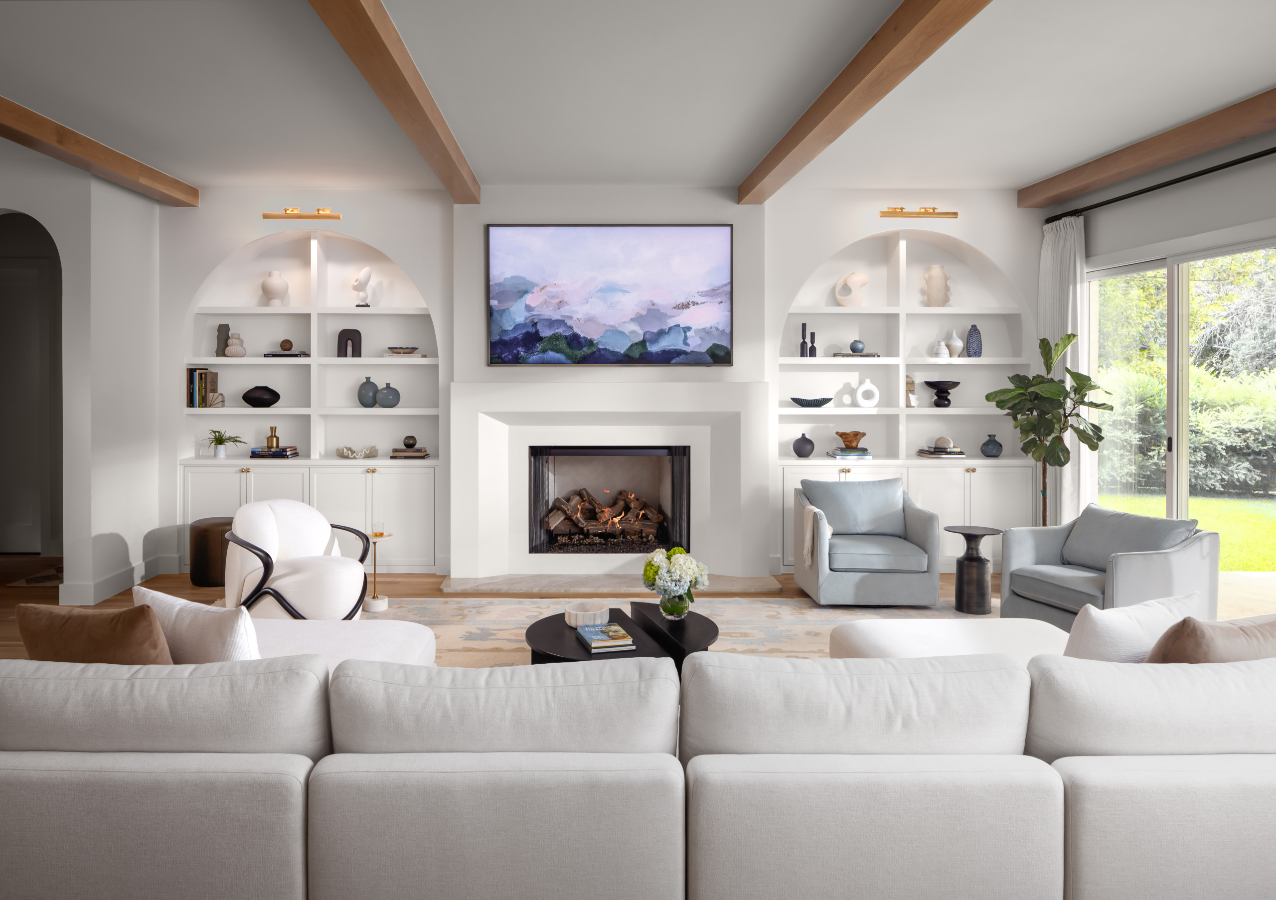 This Austin, Texas, living room by Kelley Design Group is rich in contrast: Arched windows and display niches play against a modern linear gas fireplace framed in vertical subway tile, warm white walls balance bold black accents, and clean modern lines mingle with layered natural textures. The home’s high windows shield views of neighboring homes while flooding the space with natural light. Behind the TV, an accent wall made of vertical half-round white oak slats draws the eye upward and adds warmth to the modern space.