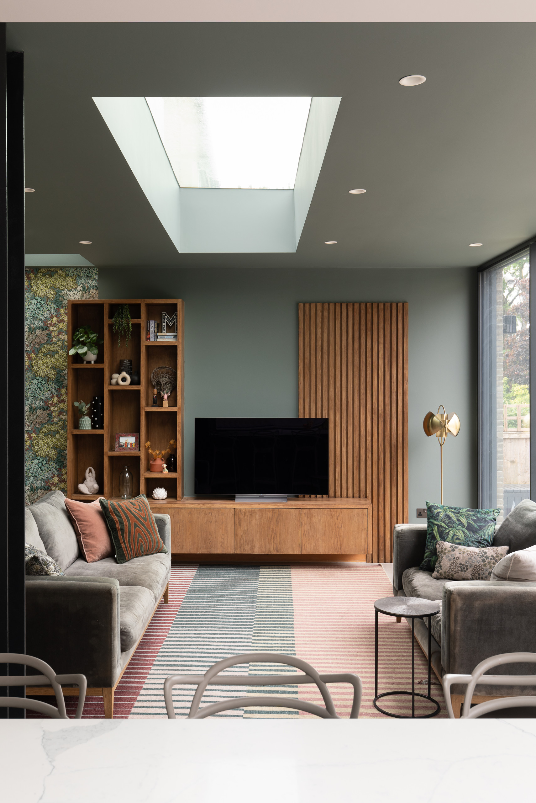 Part of a newly built rear extension of a London home, this family room uploaded by architects Ahrberg Jackson Design sits within an open kitchen-living-dining layout. Walls and ceilings painted a soft gray-green wrap the room in color, yet the space still feels airy thanks to a generous skylight and floor-to-ceiling sliding doors that open to the backyard. A broken-stripe rug and pillows on twin sage sofas pull in gentle rose tones. A warm midtone wood media unit with closed storage, display shelves and a vertically slatted accent panel adds texture and function.