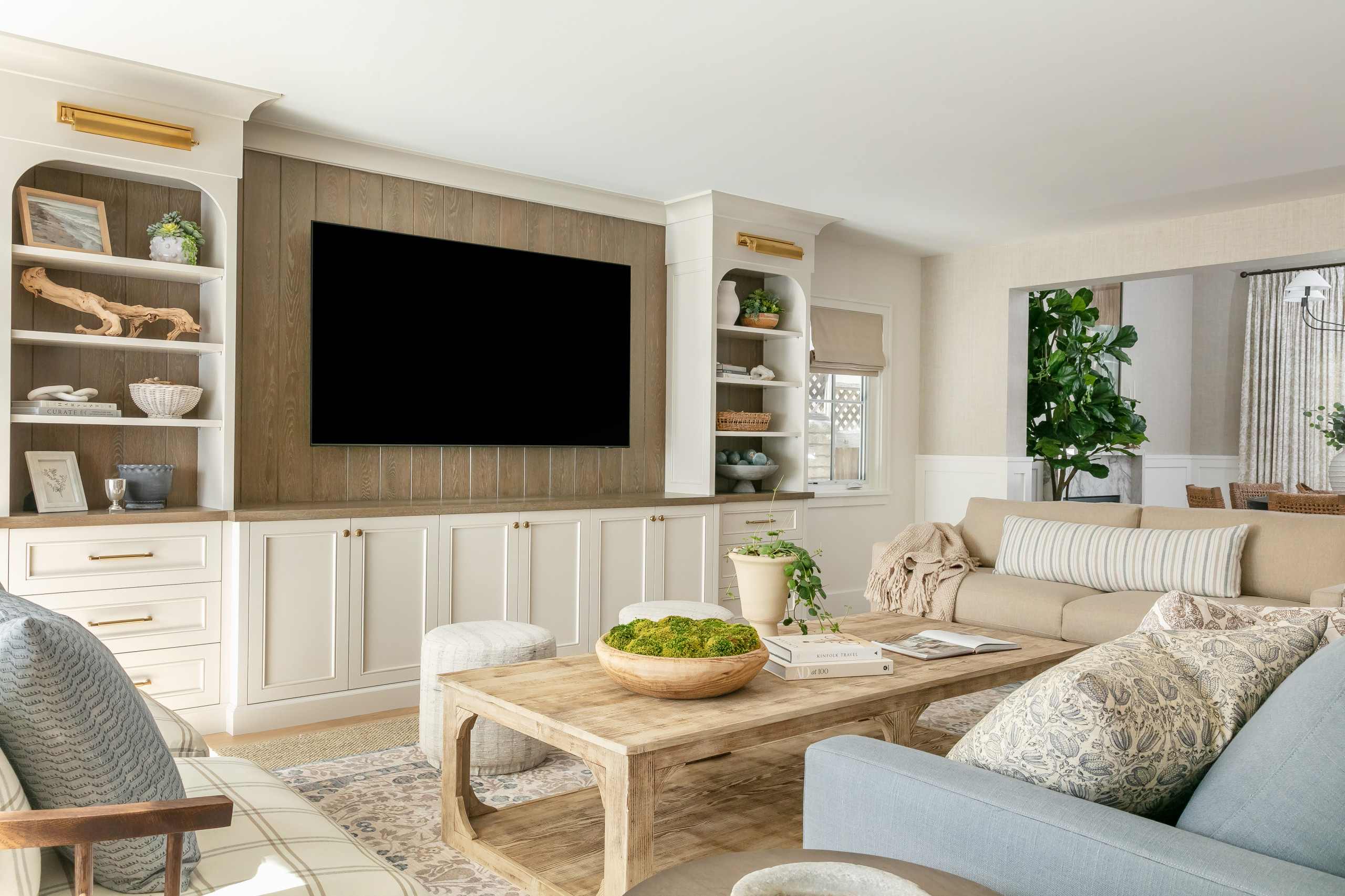 This Newport Beach, California, living room designed by Alicia Torosian has a serene and inviting look and feel thanks to its curved lines, plump pillows and soft, coastal palette of creamy white, chambray blue and warm wood. Built-in painted cabinets (Edgecomb Gray by Benjamin Moore) and tongue-in-groove paneling surround the TV, and two sofas and two custom chairs are set up for family time in front of the tube.