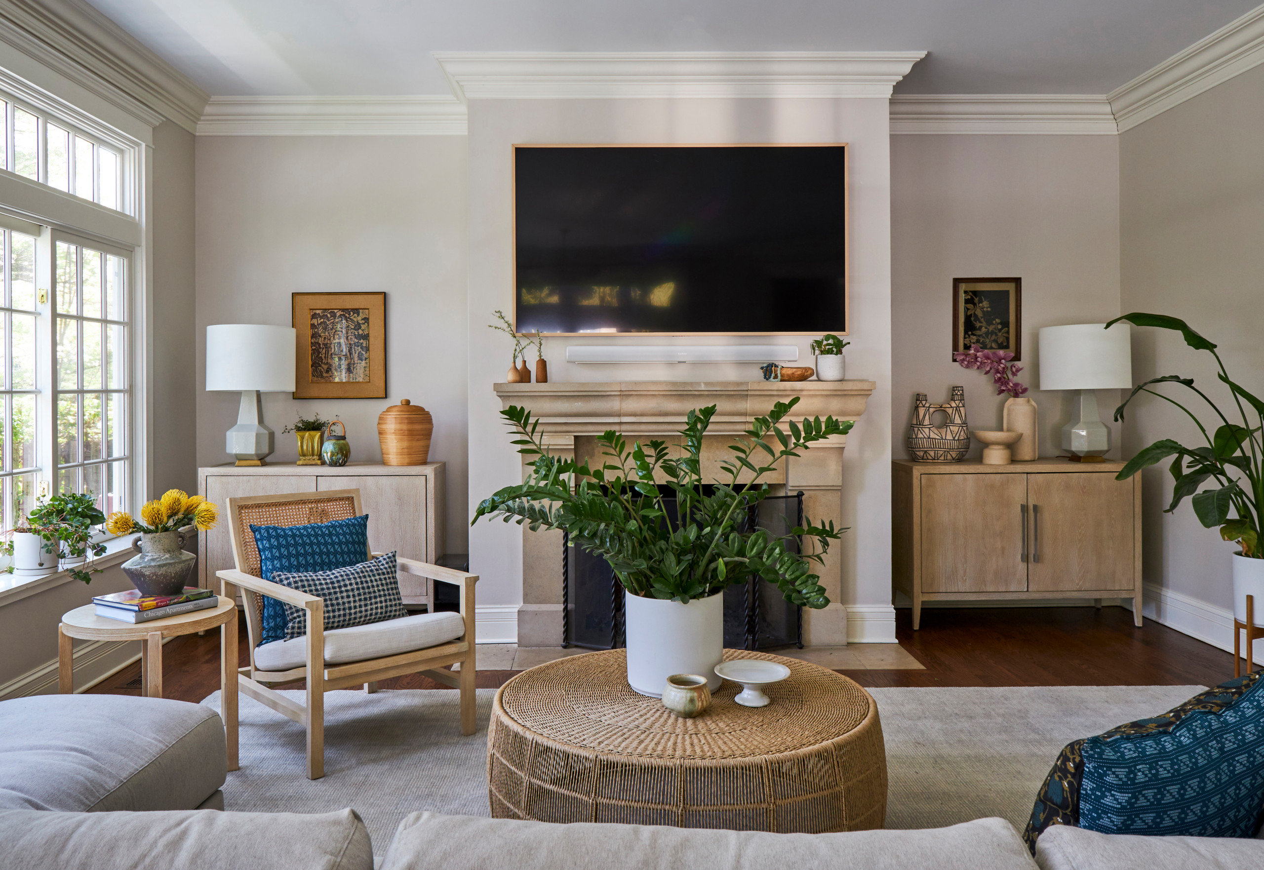 Imparfait Design Studio gave this sun-filled living room in the Chicago suburbs a coastal look with sandy tones, splashes of blue and a woven coffee table and chair. The room’s casual vibe and purpose are underscored by the large-screen TV above the fireplace. But more formal elements, including the ornate stone fireplace surround, elegant molding and dark-stained floor, balance the beach-style decor with architectural refinement.