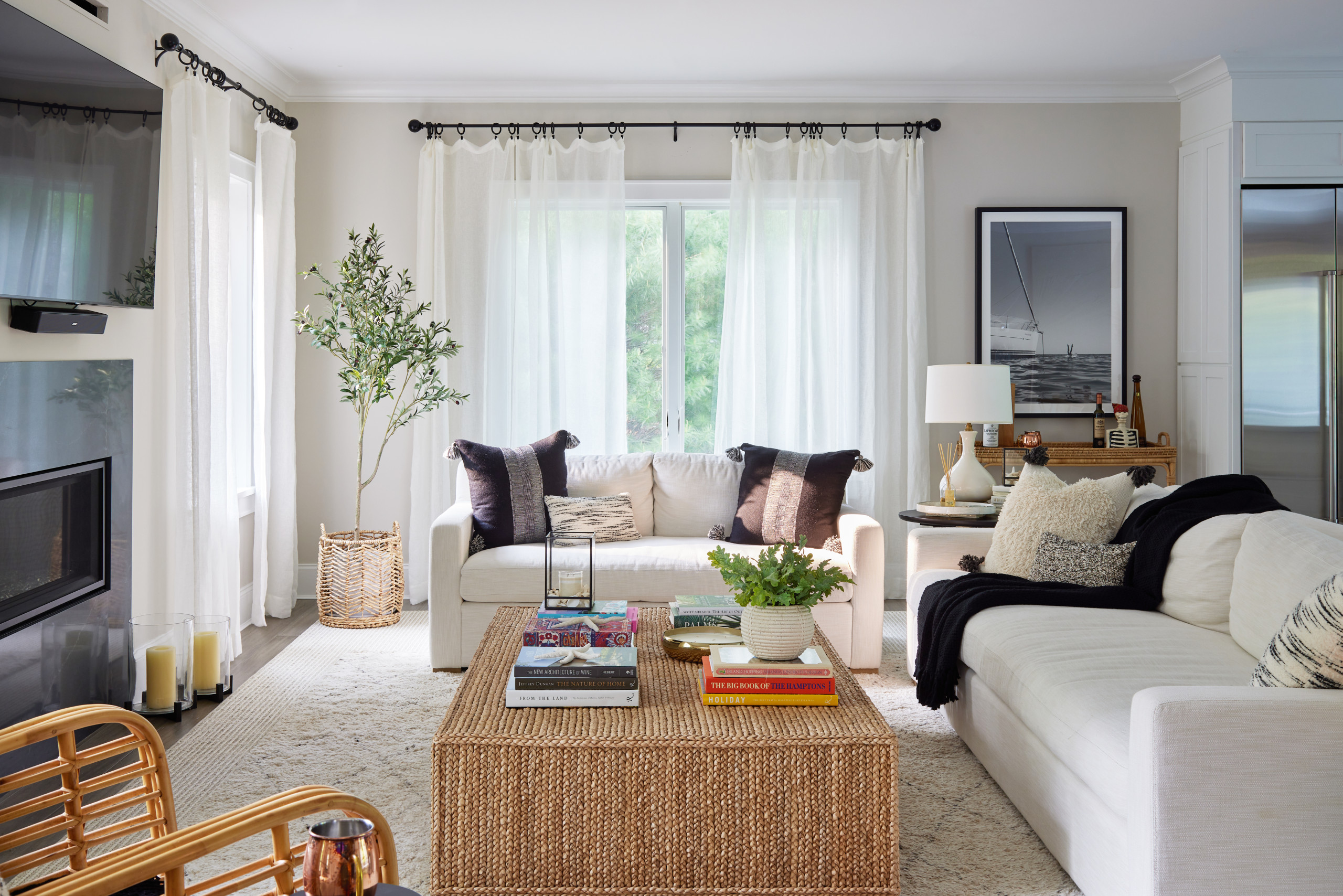 Another coastal living room — this one by Jill Romine Interior Design in East Hampton, New York — is drenched in sunlight filtered through gauzy white drapes. A natural-colored rattan chair in the foreground, a woven bar cart and basket in the background and a large braided seagrass coffee table in between warm up the mostly black-and-white palette.