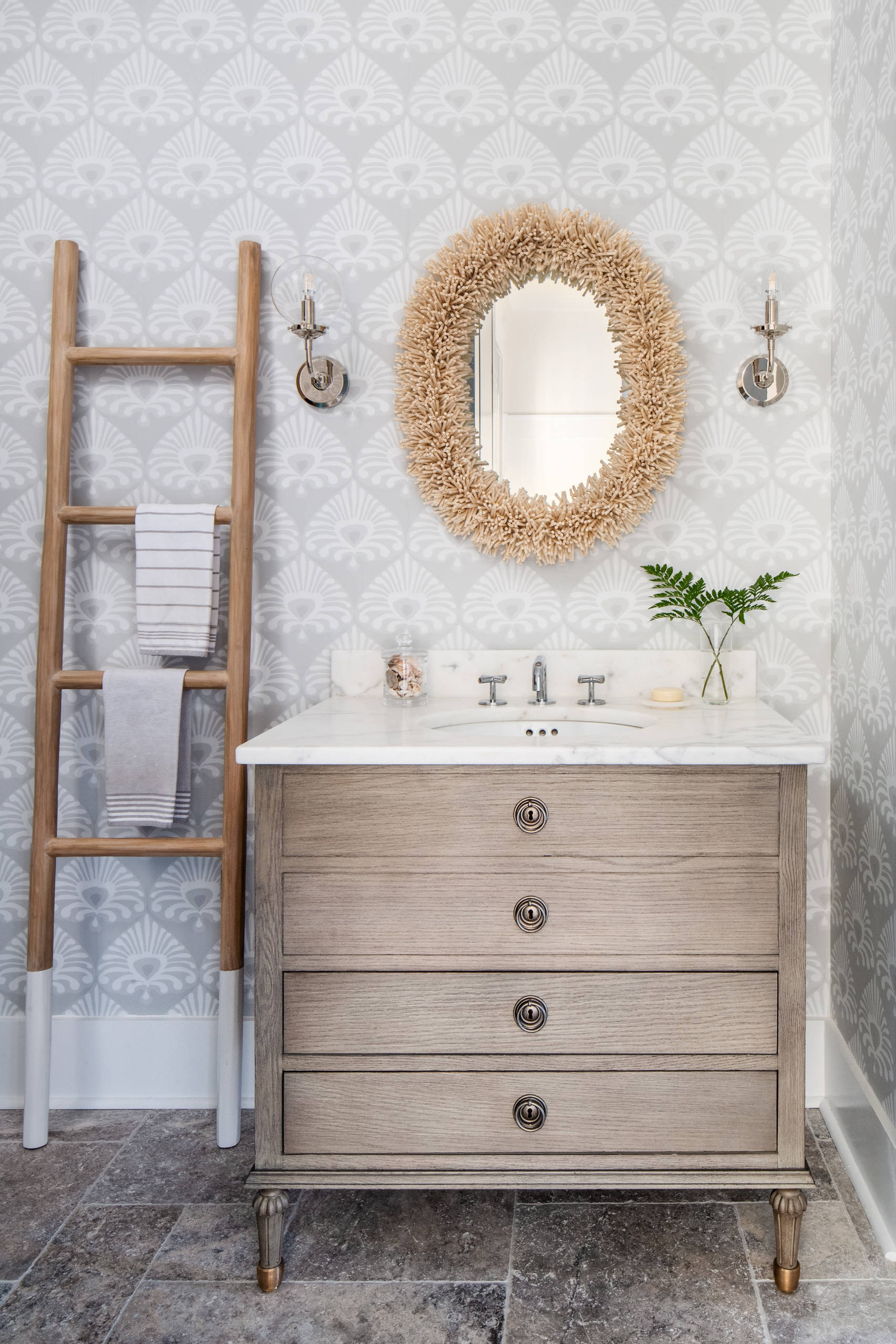 The marble-top light wood vanity features custom brass leg caps that add height and interest. The textured mirror recalls the sea and warms up the cool gray walls. The leaning ladder towel rack adds another casual element to the room and prevents damp hanging towels from damaging the wallpaper.