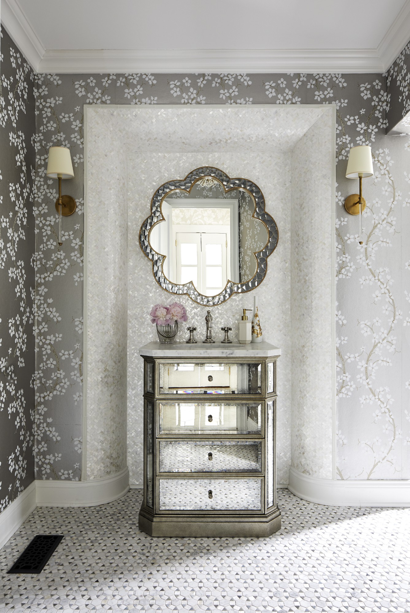 This powder room in an 1840s Colonial home in New York shines like the inside of a jewelry box. The space features a mirrored vanity and metallic floral wallpaper. Pearlescent mosaic tile covers the niche surrounding the vanity and flower-shape mirror, crowning the glamorous, traditional design by Jules Duffy.