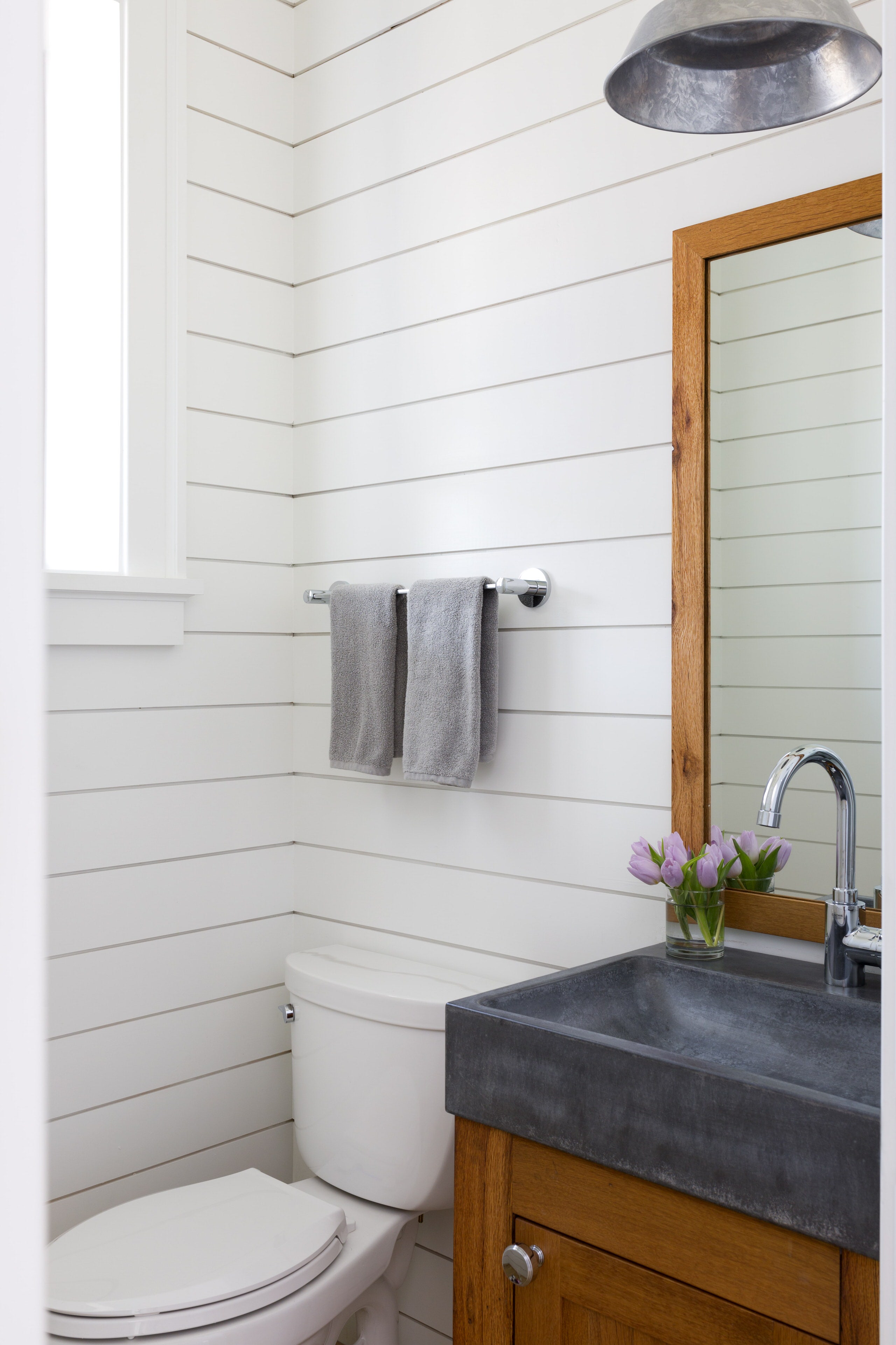Warm wood accessories, white shiplap walls and a concrete trough sink come together in this modern farmhouse-inspired powder room in the Washington, D.C., metro area. Laura Fox, who designed the whole house, channeled coziness and comfort in every room.