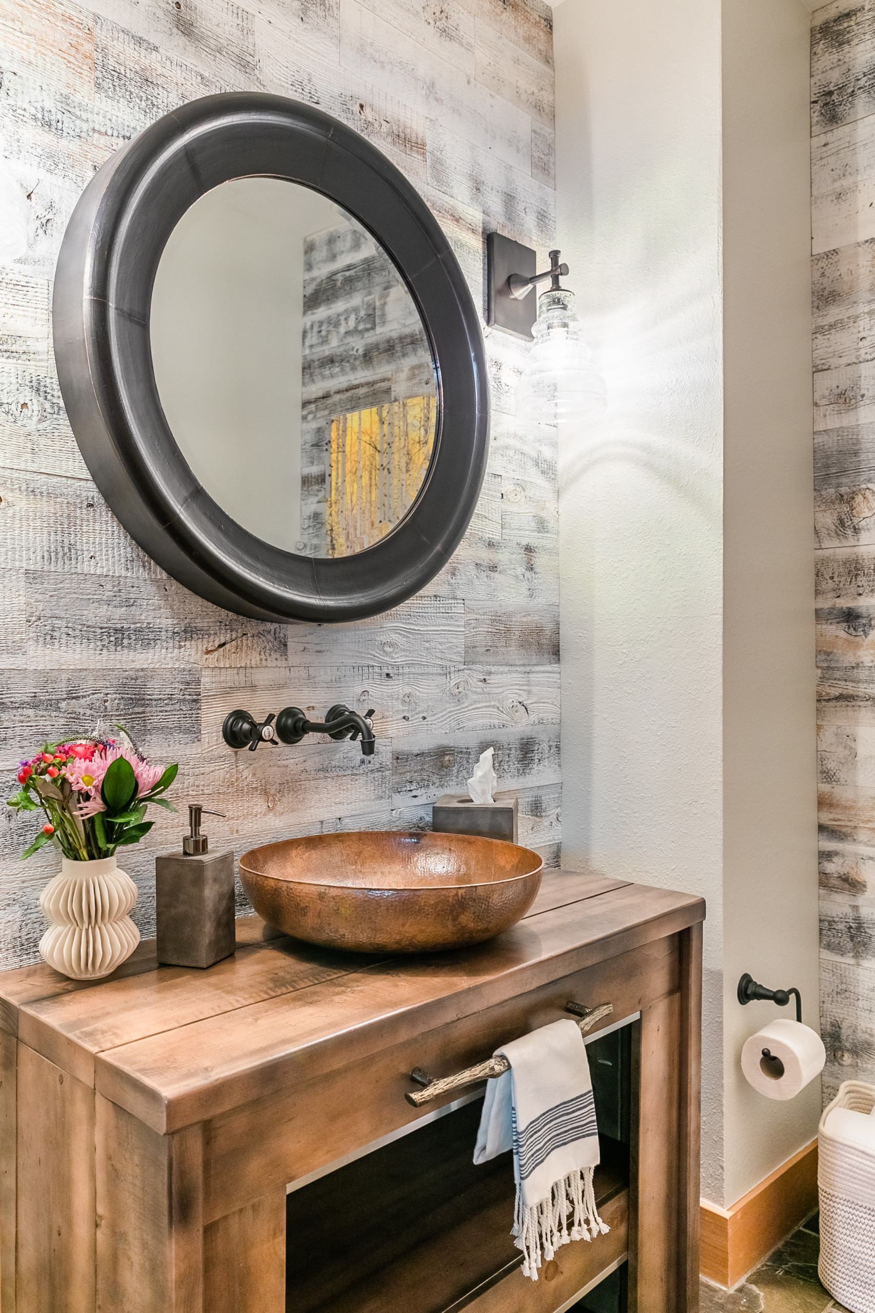 Designer Margarita Bravo stayed true to Colorado’s rustic Western roots while also creating a feeling of refinement in this powder room near Denver, pairing elements like wood shiplap and a distressed wood vanity with a copper vessel sink and dark bronze fixtures. A hand towel is draped over a branch-shape handle as one last elegant yet rustic touch.