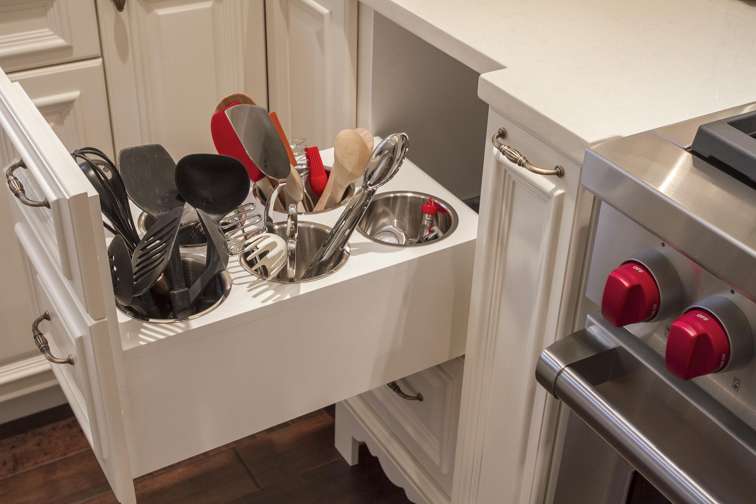 3. Utensil drawer. This clever utensil built-in keeps serveware and silverware conveniently in check. Added to more than 260,000 ideabooks, this image is one of the most popular on Houzz. If you want the look but can’t afford custom, take the DIY route by placing stainless steel pots in a deep, empty drawer.