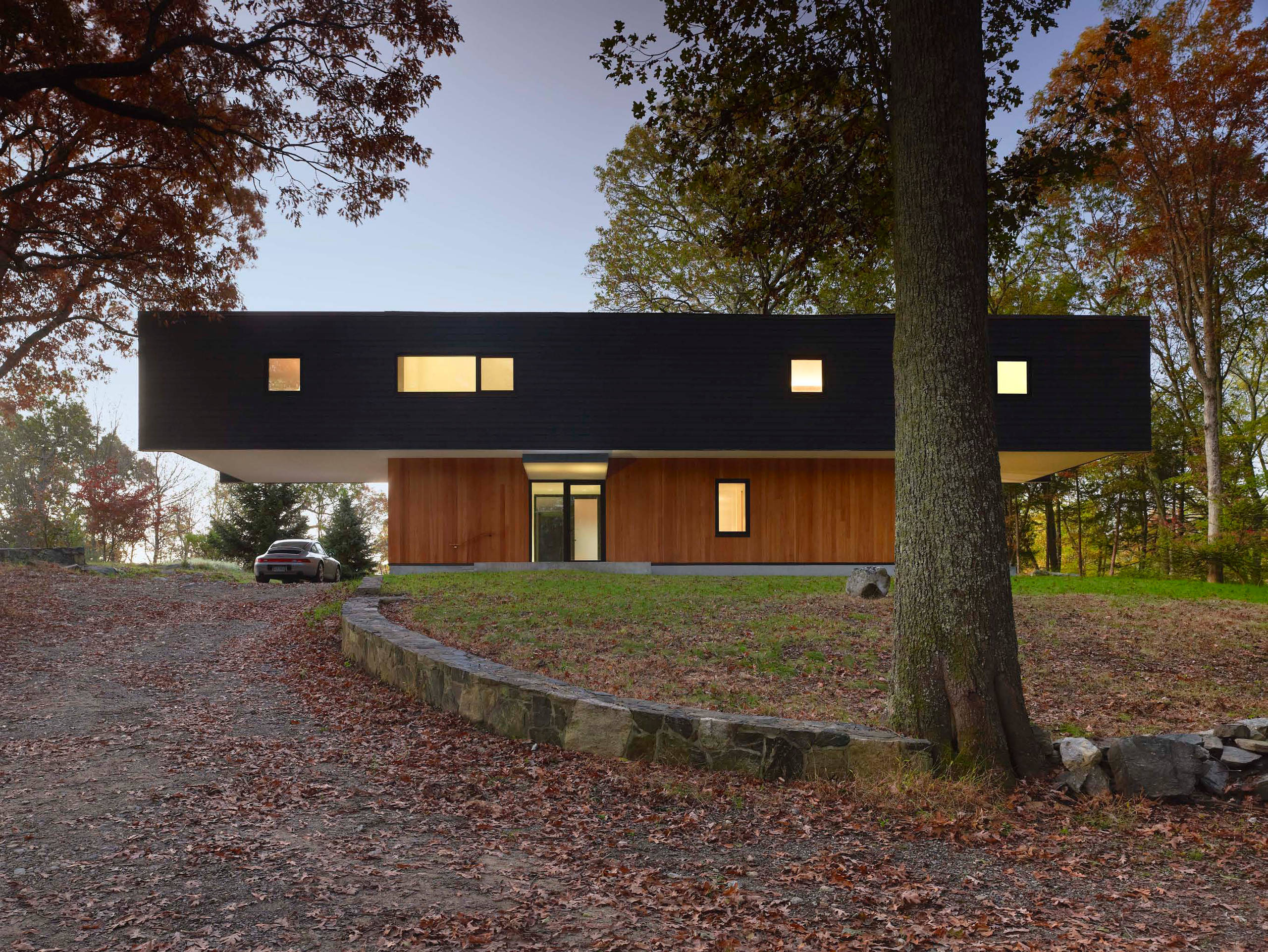 This vacation home in Waccabuc, New York, sits on a 3-acre lot and is made up of two volumes: a squarish lower floor and a linear bar of the upper floor that cantilevers 20 feet on both the east and west ends.