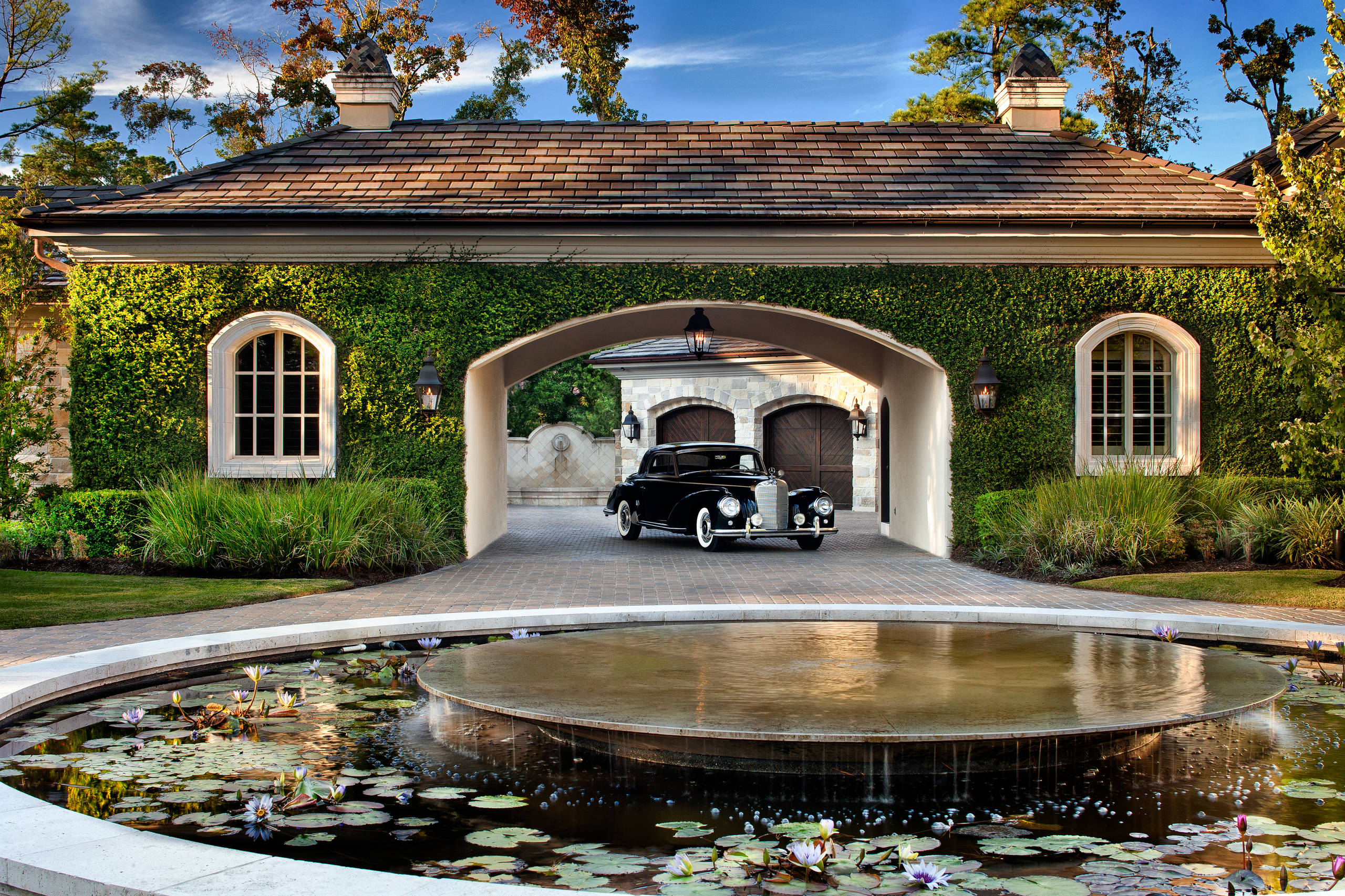 Even homes with garages can benefit from additional covered parking. This ivy-wrapped Houston home has a carport that serves as a stylish parking spot at the entrance of a central courtyard.
