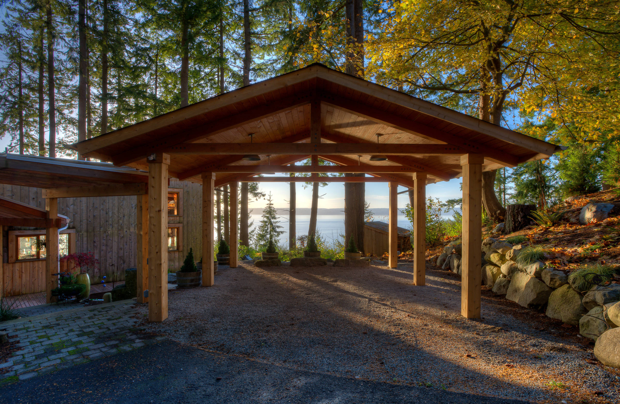 Carports aren’t just for modern homes. This rustic carport in Seattle, built by Designs Northwest Architects, is made from raw timber beams and allows for stunning water views.