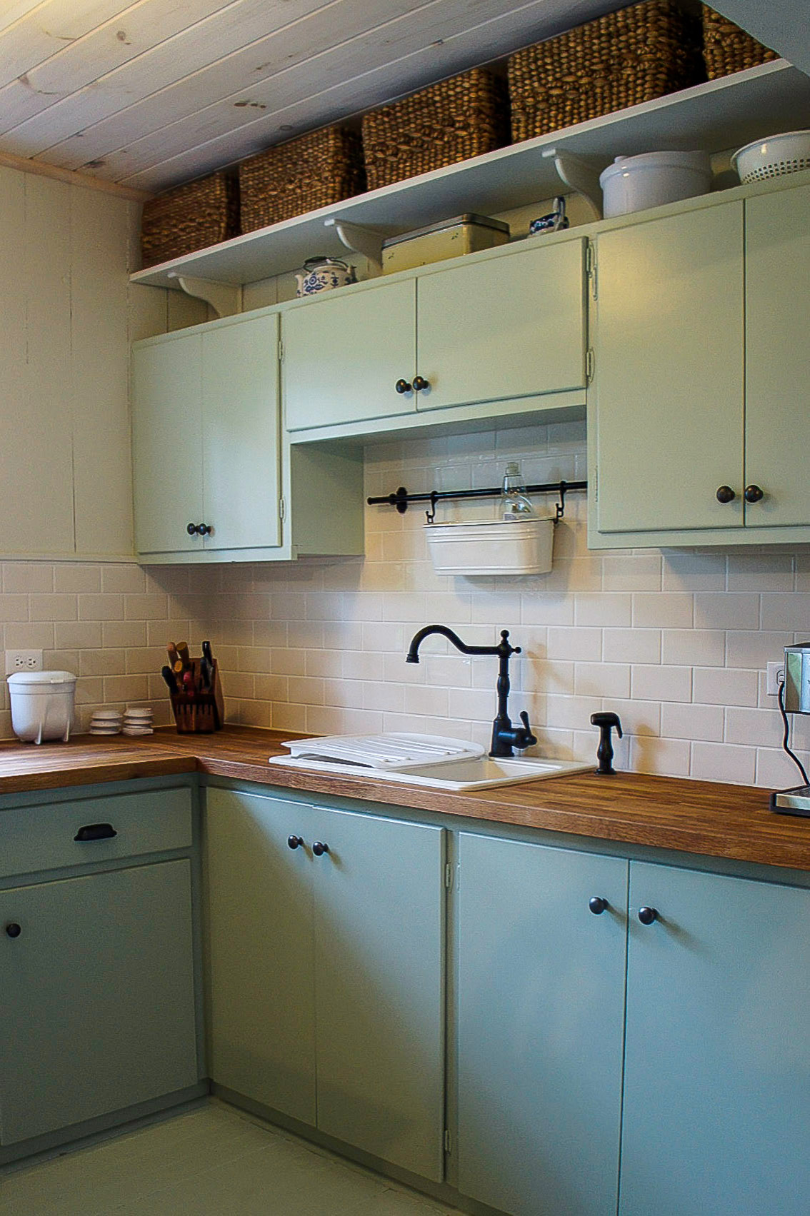 Backsplash tile: Colour & Dimension Series in Biscuit, Olympia Tile; lower-cabinet paint: Saybrook Sage HC-114, Benjamin Moore; upper-cabinet paint: Hollingsworth Green HC-141, Benjamin Moore