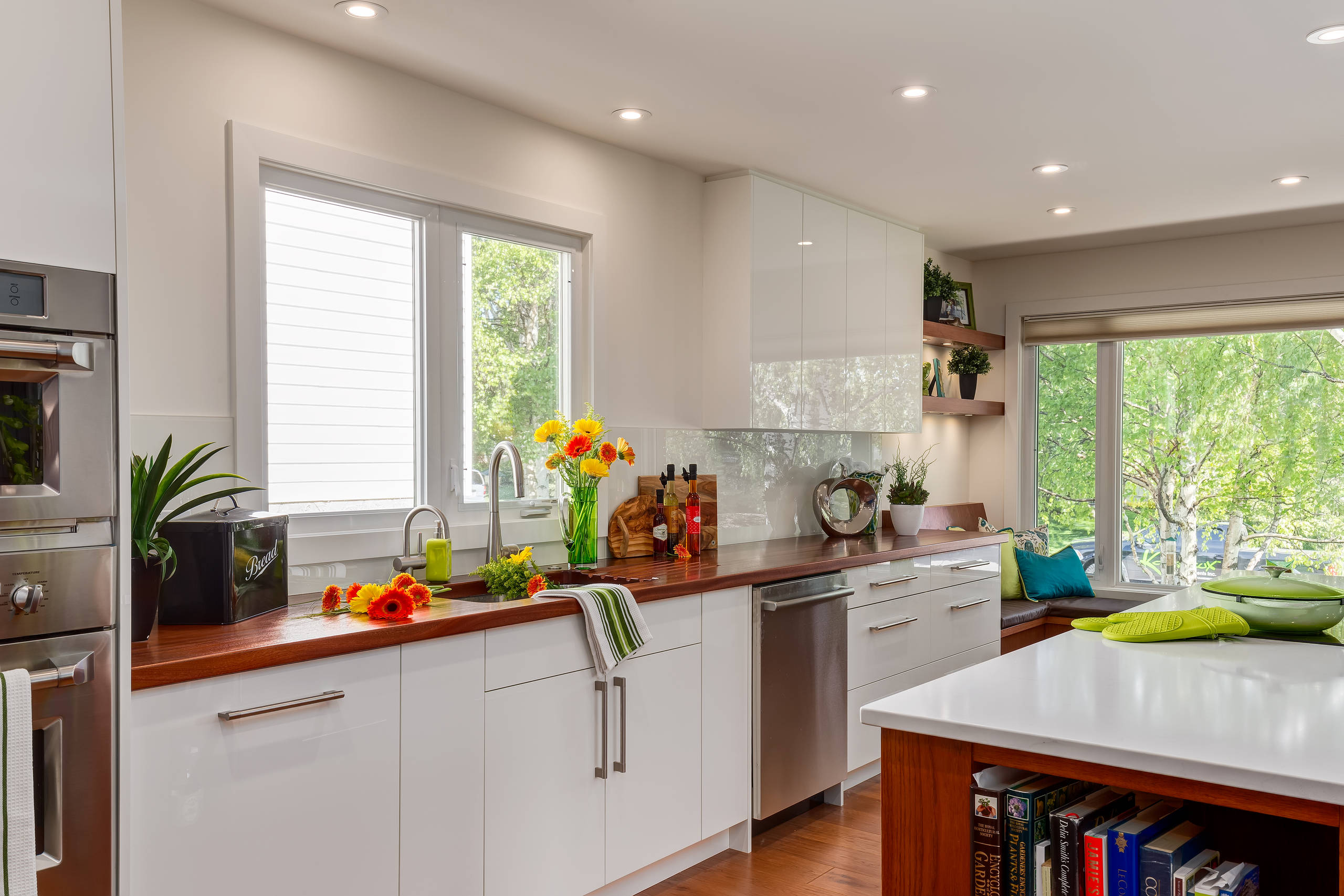 Back-painted glass. We saw earlier how well this works in color in the midcentury modern home. White back-painted glass with white cabinets add gloss over the counters and enhance the contemporary look. In a sleek kitchen like this, it’s hard to imagine a better choice than wood countertops. They inject a natural texture and color in the sea of glossy white.