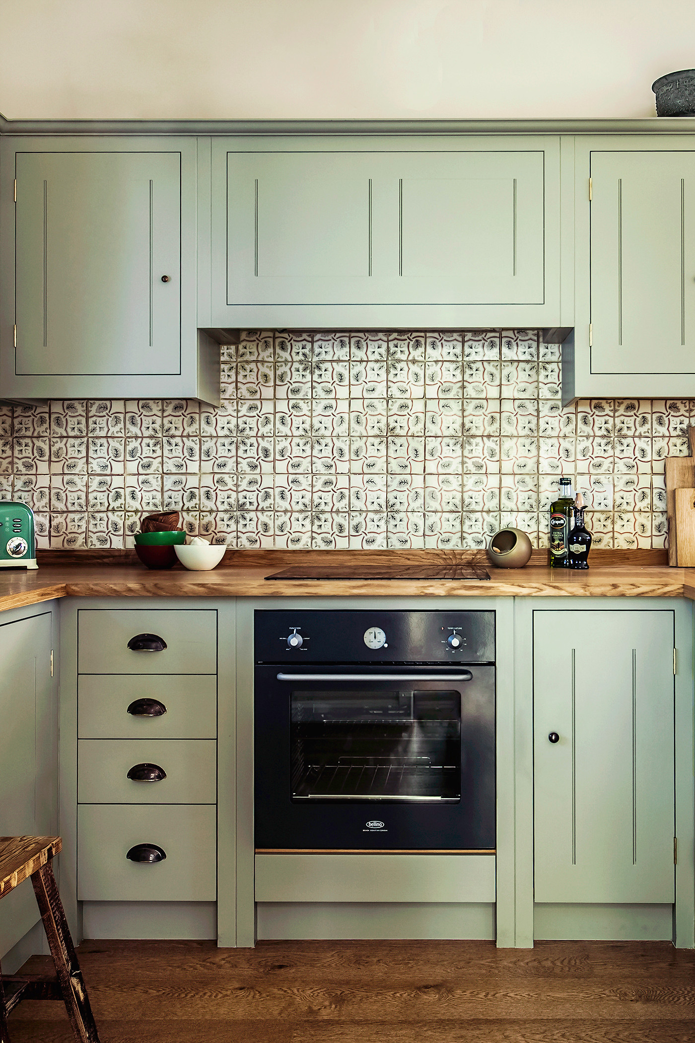 Hand-painted tile. In this traditional London home, the lively pattern in the tile picks up on the cabinet color and the colors in the wood. The backsplash appears only on this one accent wall; the rest of the counters are backsplash-free.