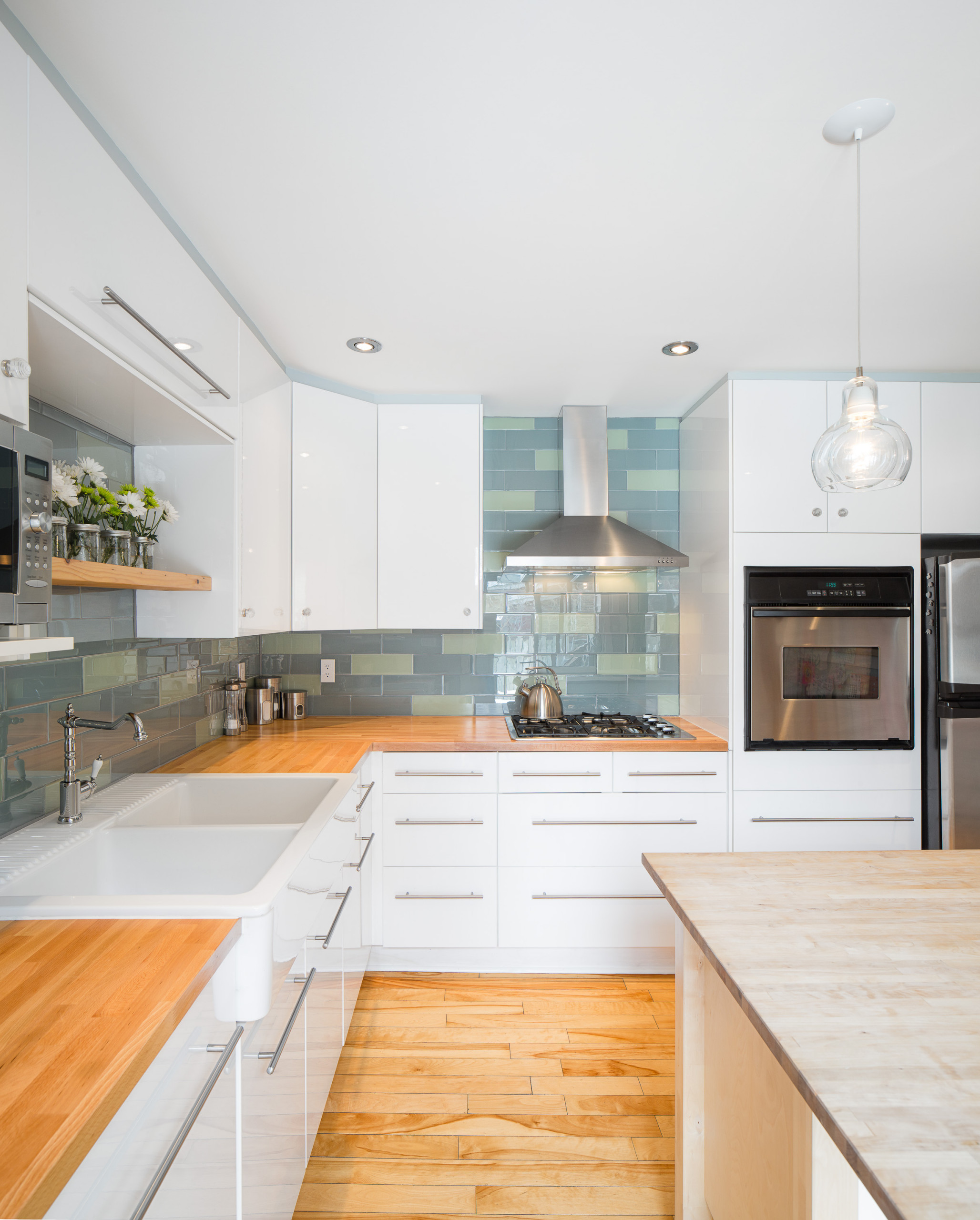 Colored tiles. A kitchen with crisp, white cabinetry and wood counters allows colorful tiles to stand out without competing for attention.