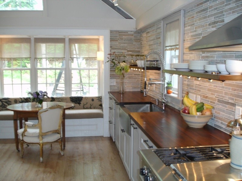 Subway tile. In my search, subway tile was by far the backsplash that showed up the most with wood countertops, no matter the style of room. However, the tiles are arranged, colored and grouted differently to suit different styles. Here the softer off-white biscuit hue lends a more aged look to a cottage kitchen.