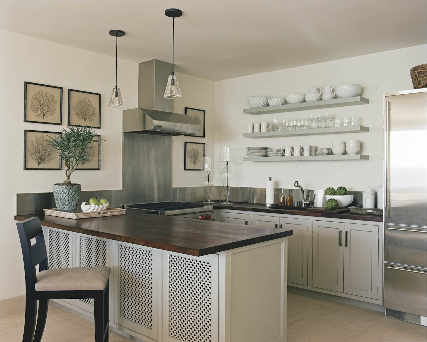 Stainless steel. Style along the Mediterranean coast inspired interior designer Tim Clarke’s work on this kitchen. The stainless steel backsplash adds a modern element to the more traditional Mediterranean materials such as limestone and wood lattice.