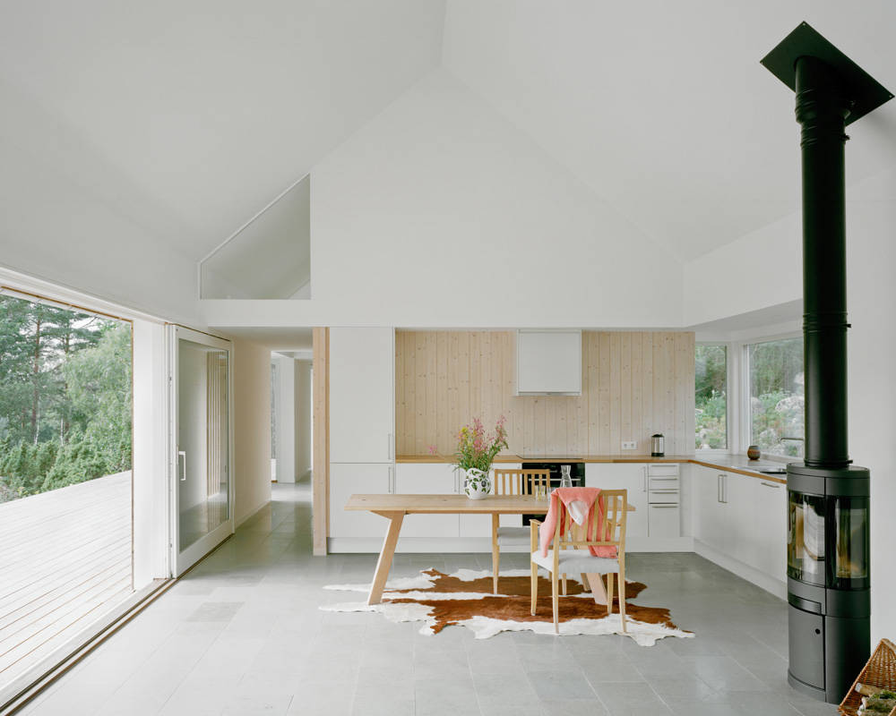 Light wood paneling. This beautiful Swedish summer home has a limited palette that is mostly white. The light wood paneling makes a striking statement and introduces a clean Scandinavian take on cabin style.