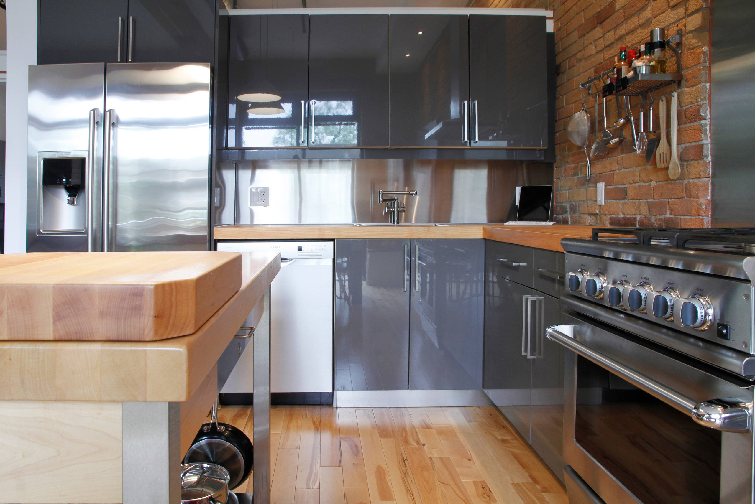 Stainless steel. This home, in a converted woolen mill, has wonderful original elements like the exposed brick wall. Stainless steel (along with glossy cabinets) adds a sleek contrast to the solid maple countertops and aged brick.