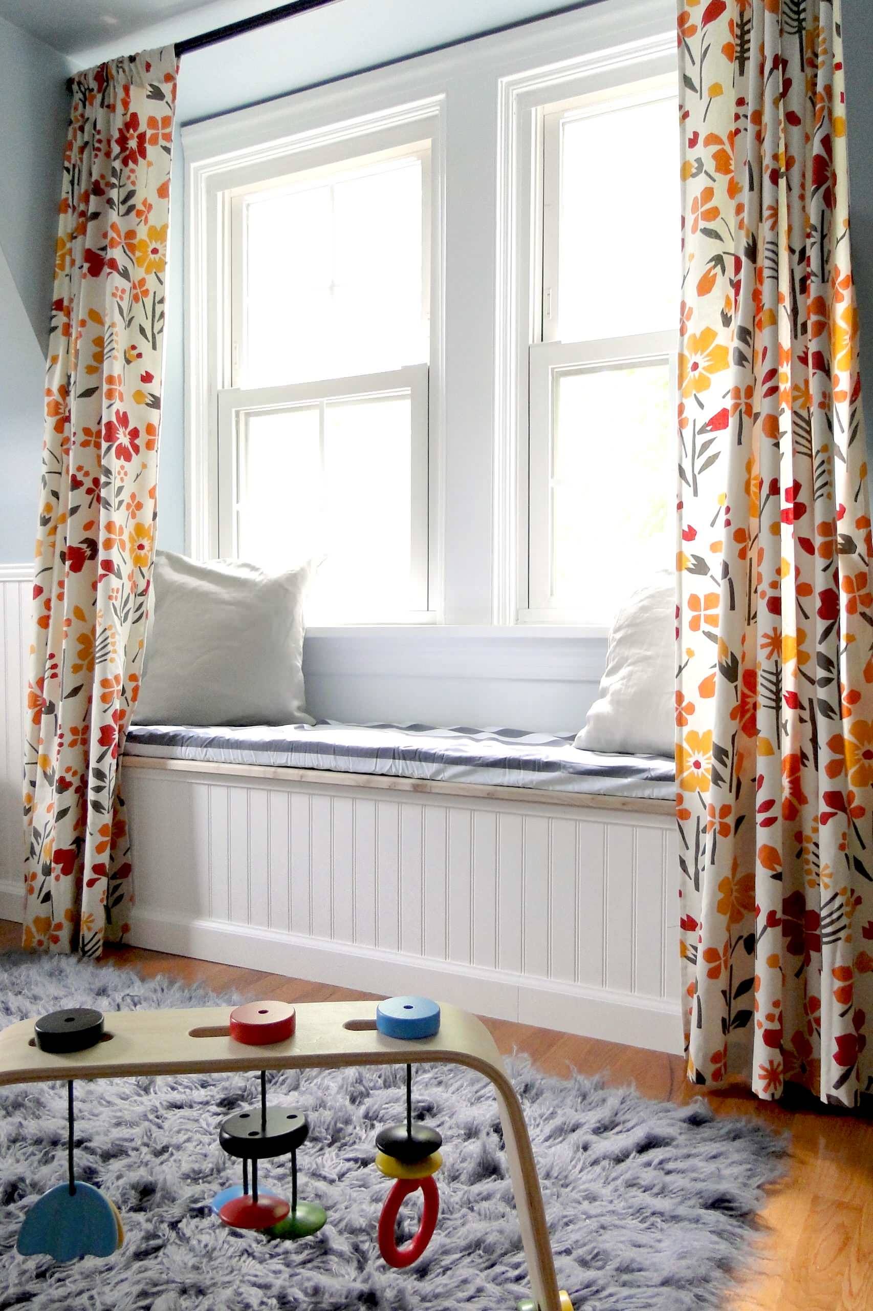 If you want a casual look and your bay window is located on the ground level (and you don’t have children), install the banquette just below the sill and toss on some pillows.