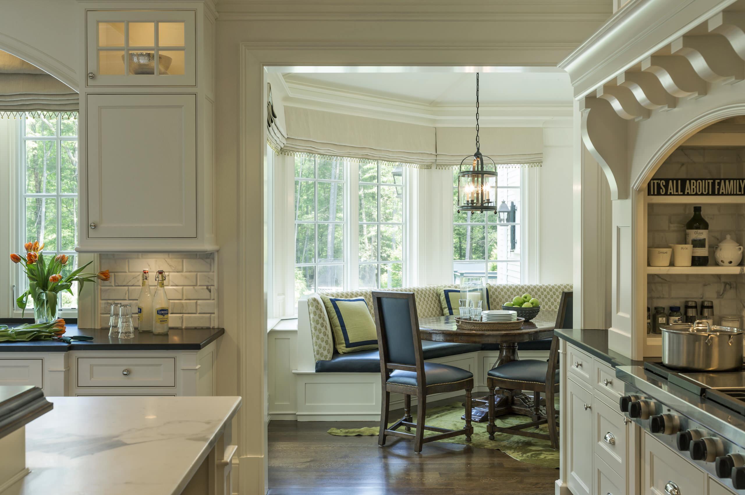 When installing a banquette inside a bay window, consider not only the height of the seat and room for legs, but also the height of the back cushions. In this home a shelf behind the back cushion provides a transition to the windowsill.
