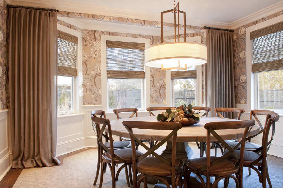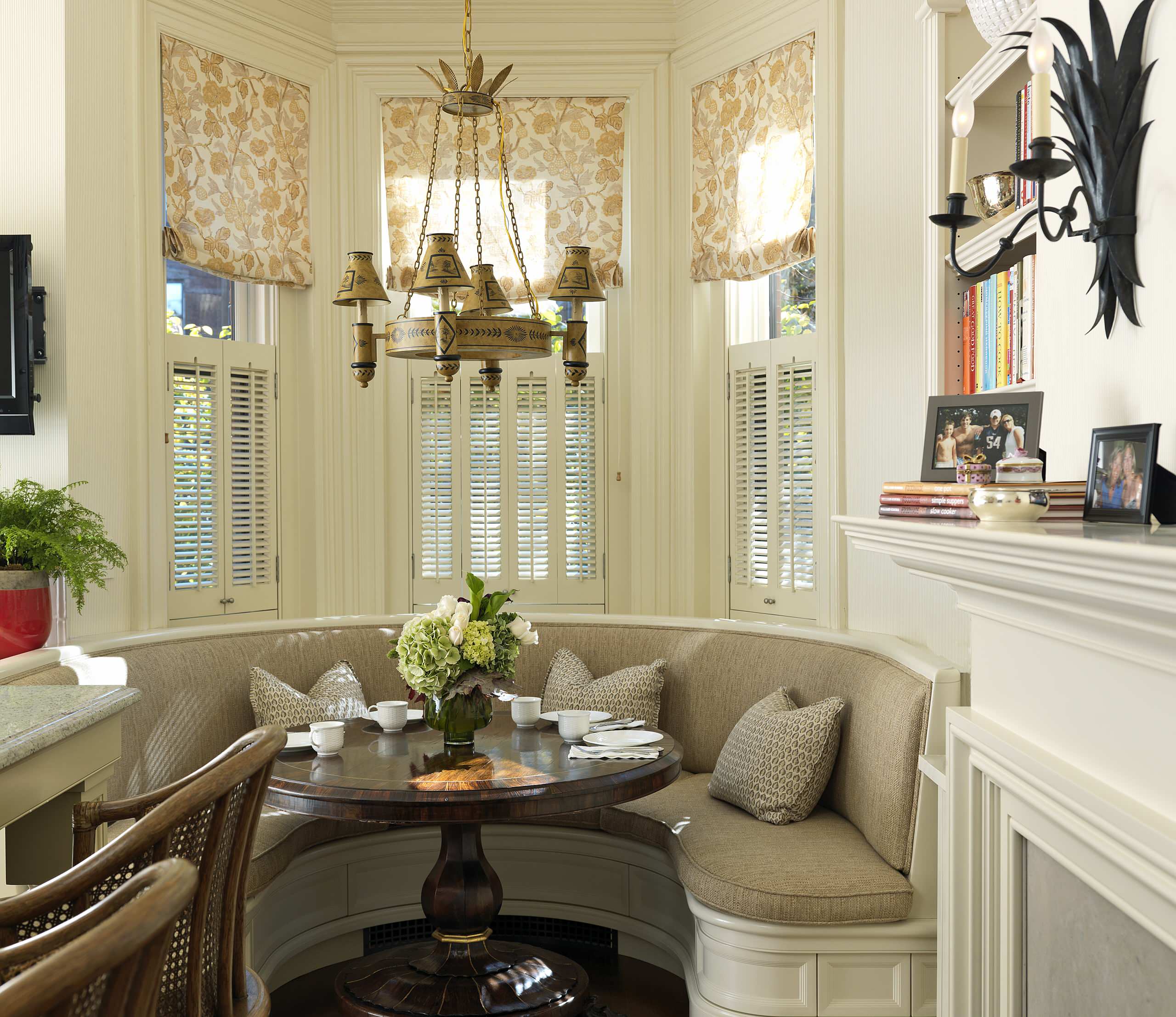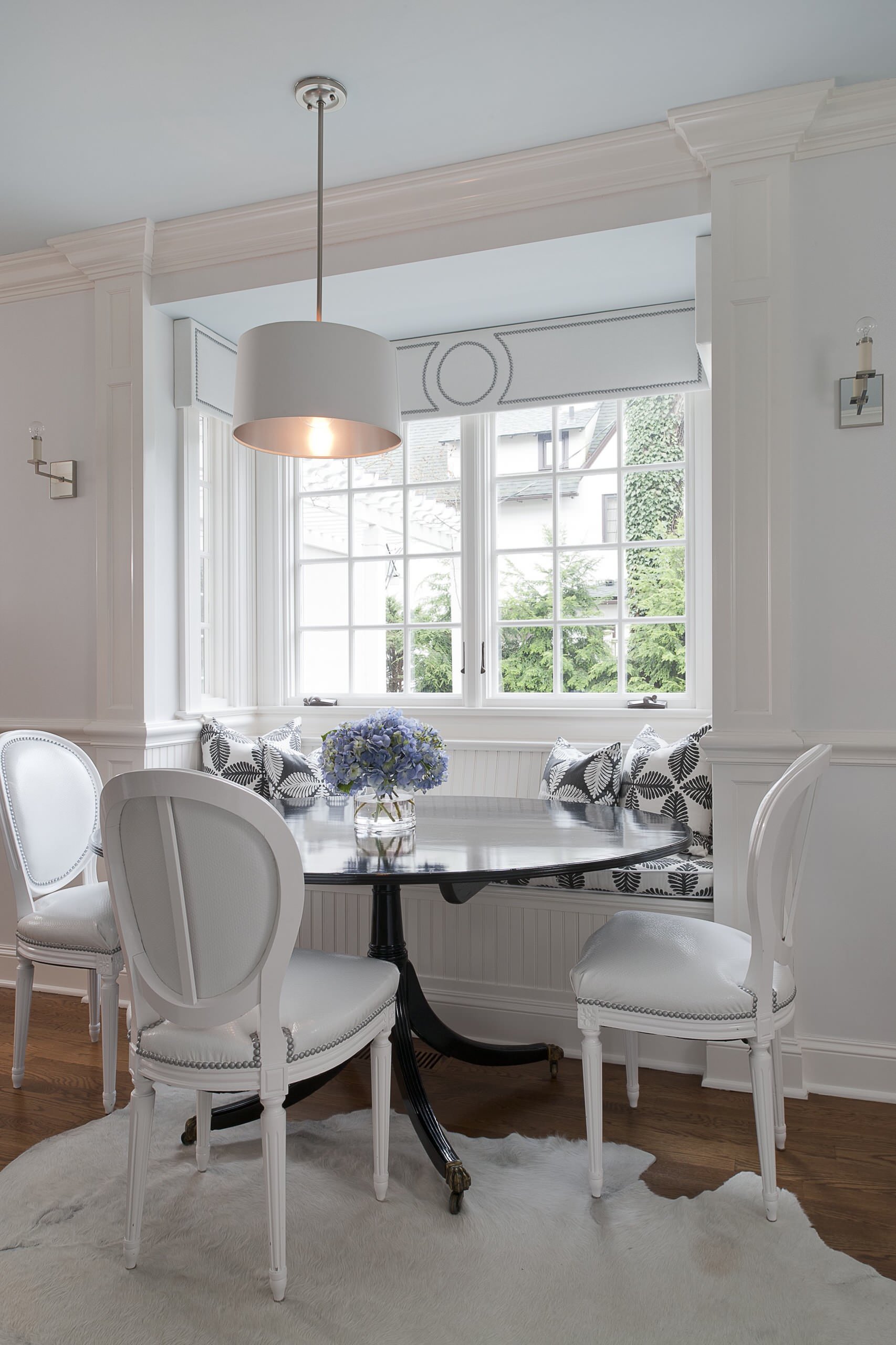 A built-in banquette is your best option when using a bay window for dining. Be sure to choose a pedestal-style table, make sure the height is right and leave plenty of legroom underneath.