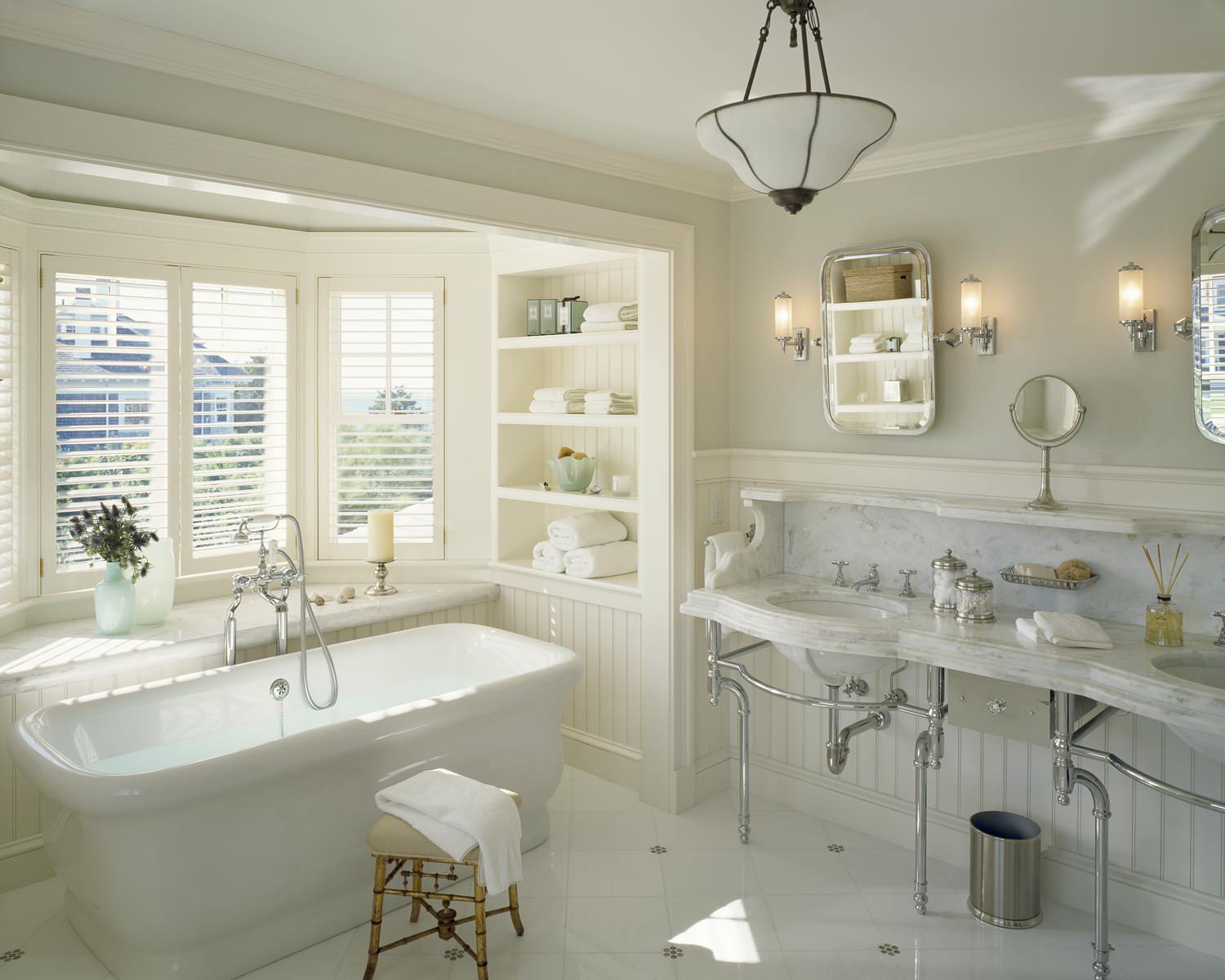 In bathrooms, tubs are typically built into bay windows, much like window seats. For a different take on the idea, use a freestanding tub and let the space around it work to highlight the depth of the room. Wood blinds keep the focus on the view beyond the windows here. (Conventional shades would have blocked the top of the view, and curtains would have attracted undue attention to the height of the counter.)