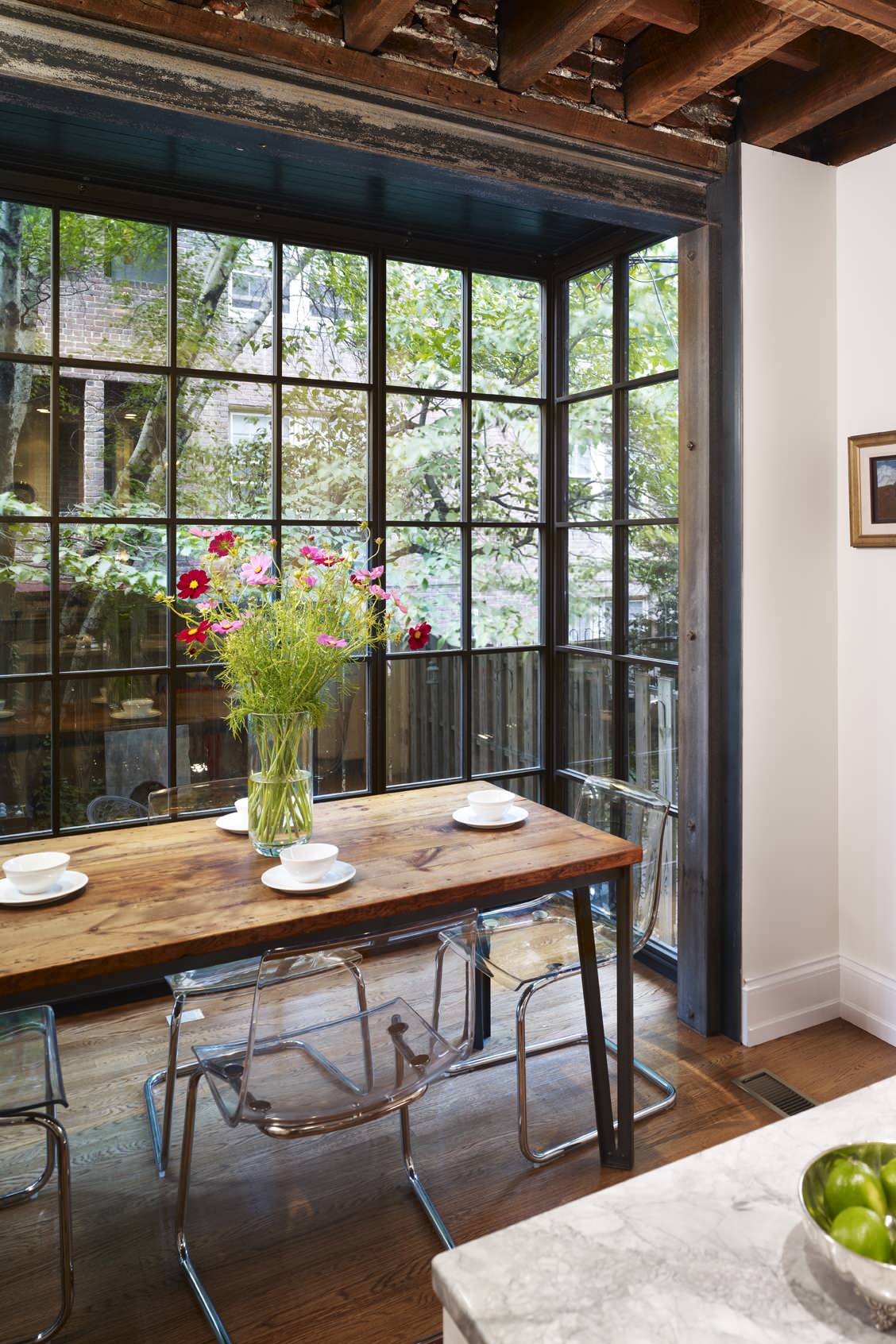 With no other furniture to distract, this dining table comfortably mimics the shape of the bay window, so it looks as if the table and window could fit together like puzzle pieces.