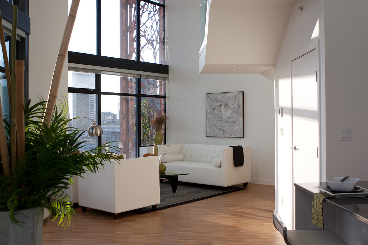 Let’s use this room as a hypothetical example. Slim, modern-style seating accentuates the city view by not blocking the window. On the other hand, an oversized roll-arm sofa with its back against the window could have send a message to prospective buyers that the living room is too small for a full-size sofa without obstructing the sought-after view. Boiling it down to a mere sofa location, the buyer might have moved on and considered a different property.