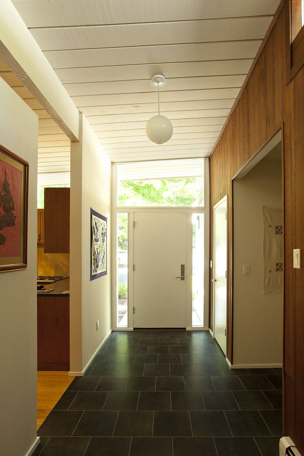 Radiant floors. Another innovation Eichler learned from Wright’s Usonians was the use of a concrete slab placed directly on the ground with radiant floor heat. Tile flooring was used in the foyer, as shown, as it’s ideal for transmitting radiant heat. Even with California’s mild climate, the warm floor underneath your feet was important to counteract the cold emanating from large glass areas in the winter.