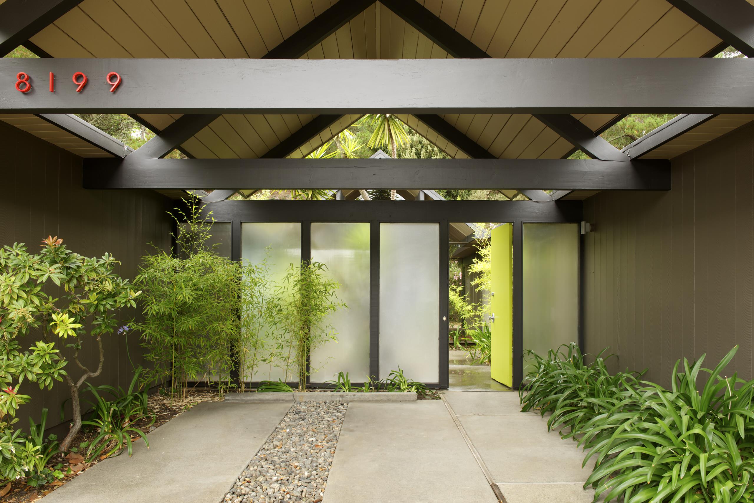 Central courtyard. Privacy was always a concern in Eichler’s subdivisions, and the large expanses of glass only compounded the issue. Wright’s Usonians were often on large wooded sites, but Eichler homes were often built nearly to their property lines. Eichler and his team solved this problem by adding central open-air courtyards to the houses. The homes were entered via a front door leading from the street to the courtyard, and large expanses of glass opened the house to the courtyard.