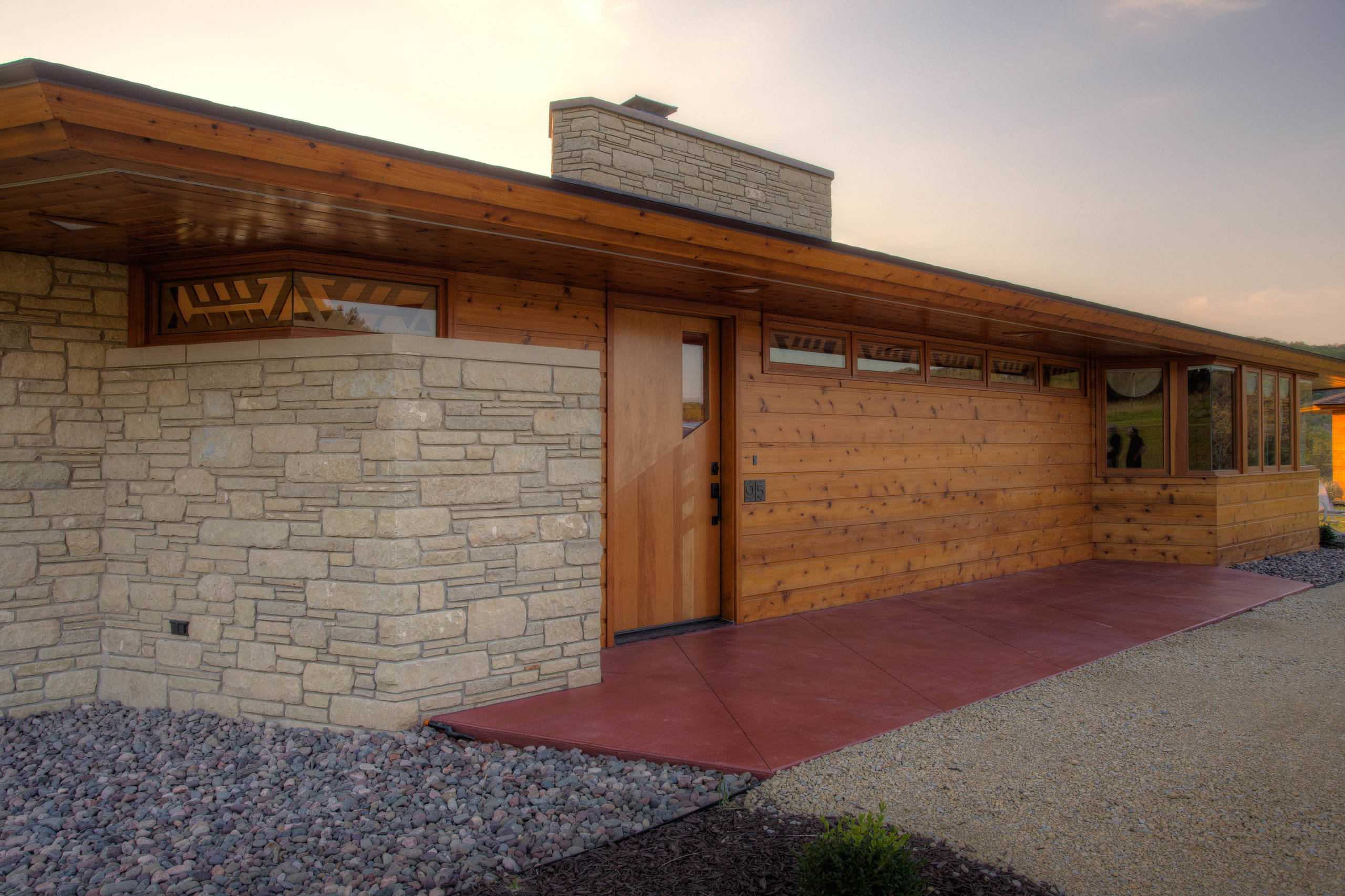Street wall. This home, by Genesis Architecture, is designed in Wright’s Usonian style. It features a broad, sheltering low-slope roof and almost no windows facing the street, making the home a refuge from hectic daily life.