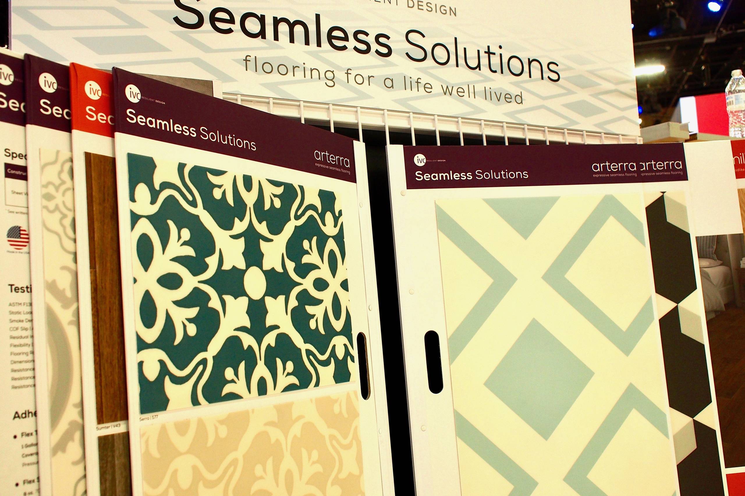 In addition to traditional tile and wood, exhibits showcased other products related to surfaces at the Las Vegas event, including colorful vinyl sheet flooring, such as these products from IVC.