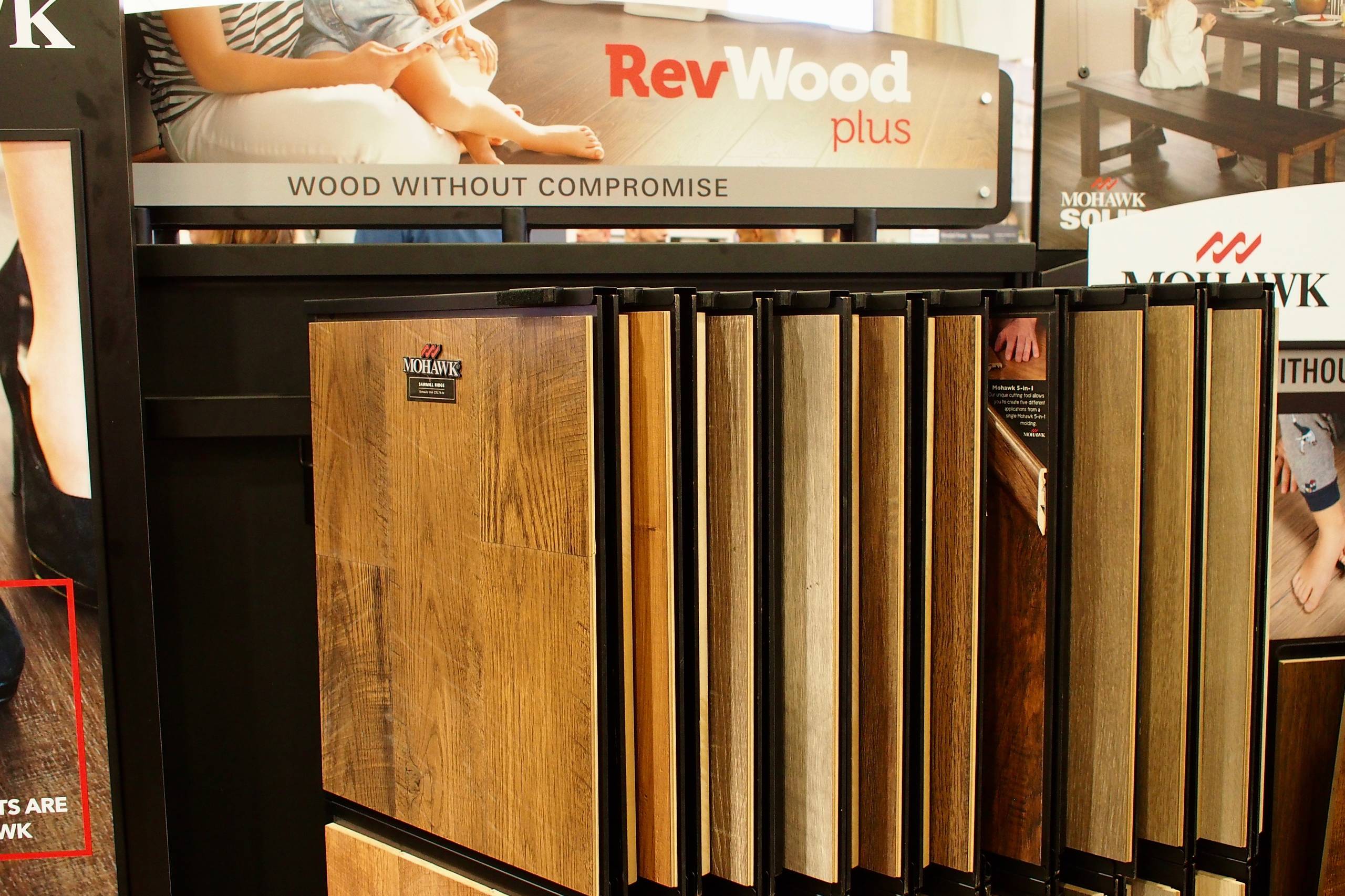 In hardwood flooring, you can still find plenty of driftwood-gray colors, but there’s been a move toward darker tones. “People are getting inspiration from nature. We’re seeing a lot more browns and natural colors,” says Angela Duke of Mohawk. “Consumers are liking those natural earth tones.” Shown here is RevWood Plus, Mohawk’s waterproof wood flooring.